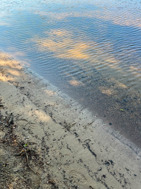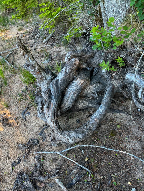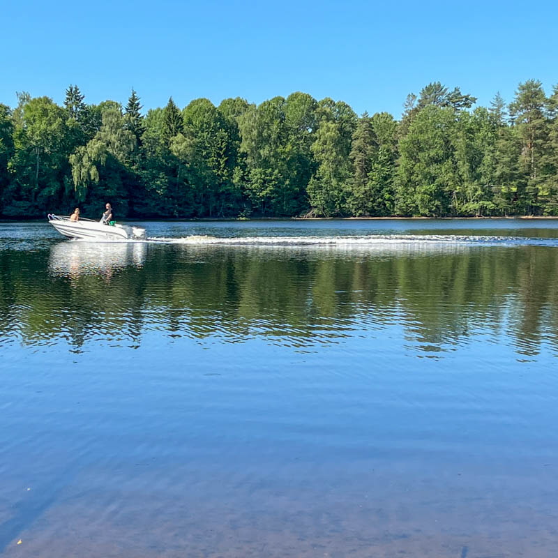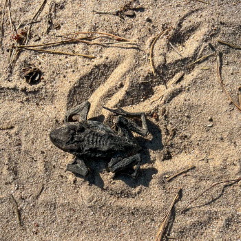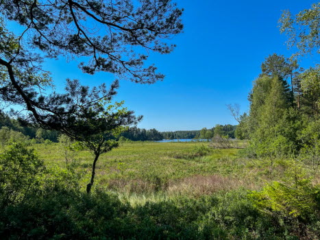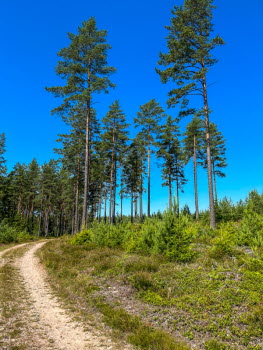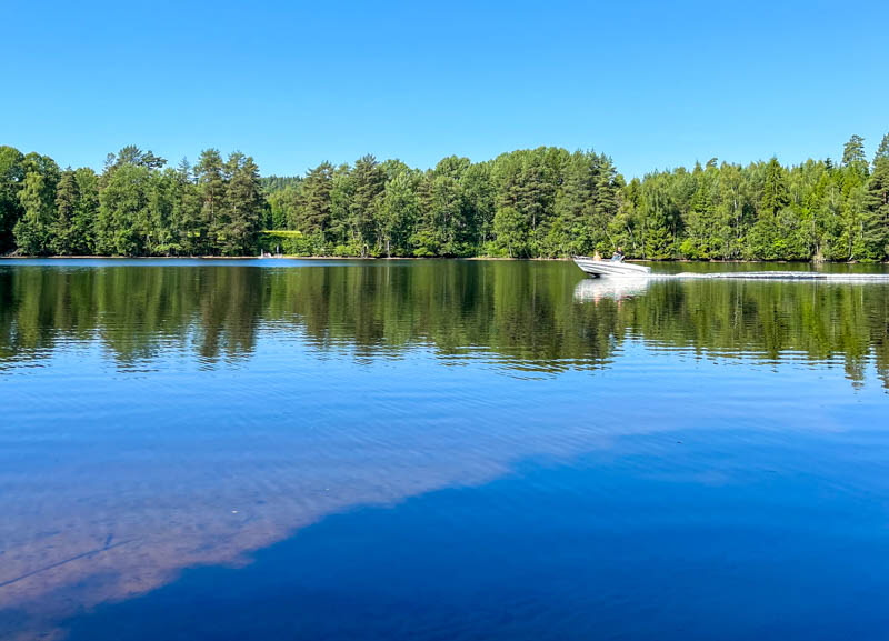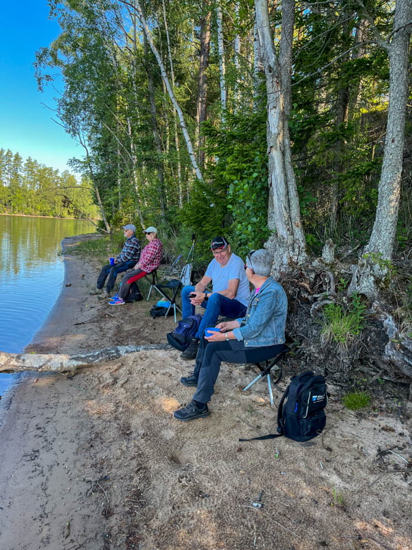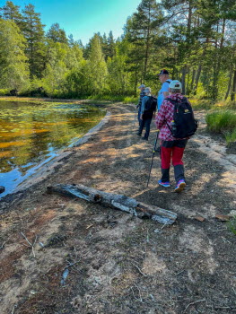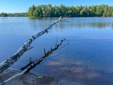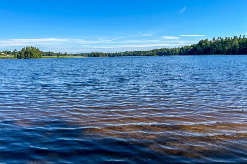 Vi åkte mot Brännsen. Vi stannade vid en avtagsväg och gick genom tallskogen ner till Stråken. På vägen låg en groda som inte såg pigg ut. I min gamla poesibok står en vers: Om du möter en groda på livets stig, nyp na i örat och hälsa från mig! Vi fortsatte och följde stranden runt Sjöbol udde. Vi stannade på strandremsan för fika.