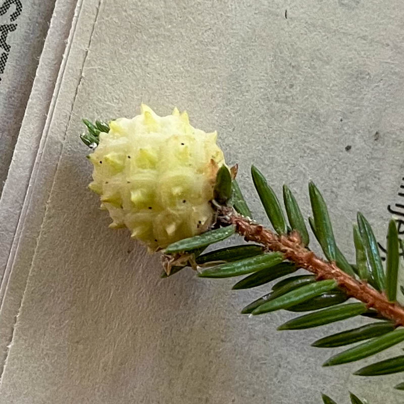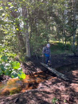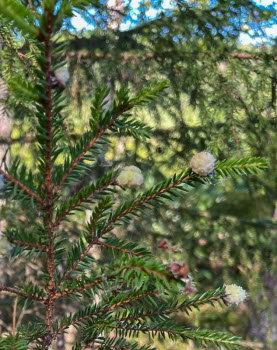 En motorbåt for förbi. Vi gick utmed Stråken söderut och kom fram till en bäck med en bro av 2 stockar. Det var bara Arne som testade att gå över. På tillbakavägen såg vi vita klumpar på en gran. Det är ananasgall. Den sitter på spetsen på en gran och orsakas av granbarrlusen. Till en början är den ljus och mjuk och blir sedan brun och hård.