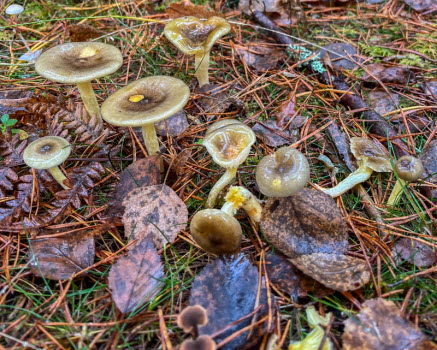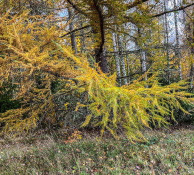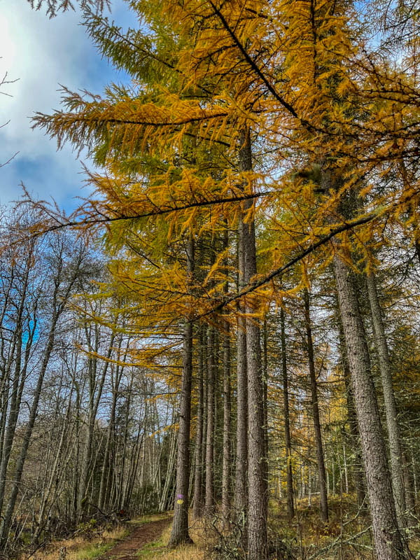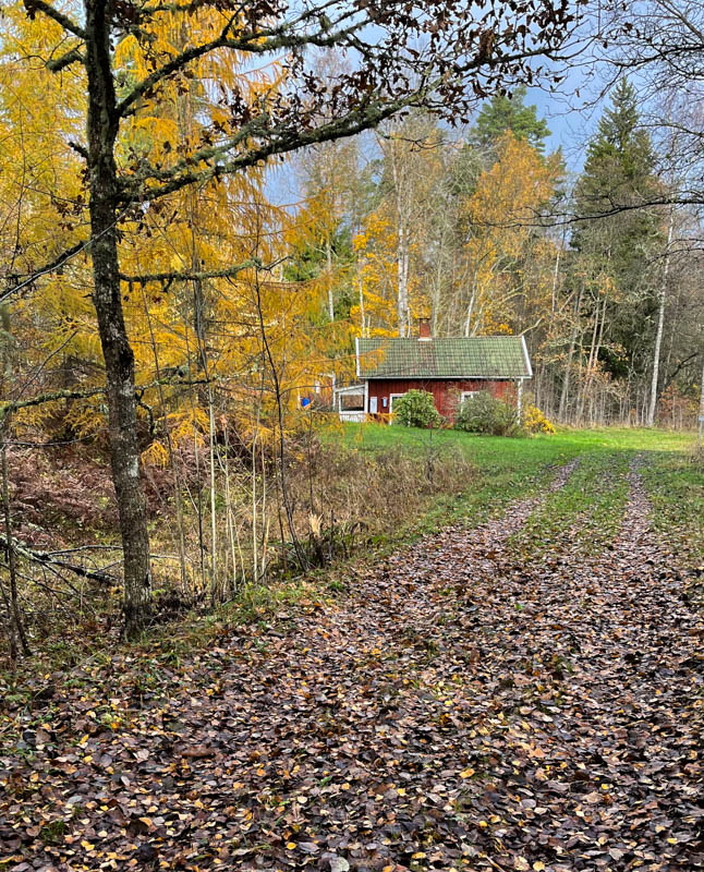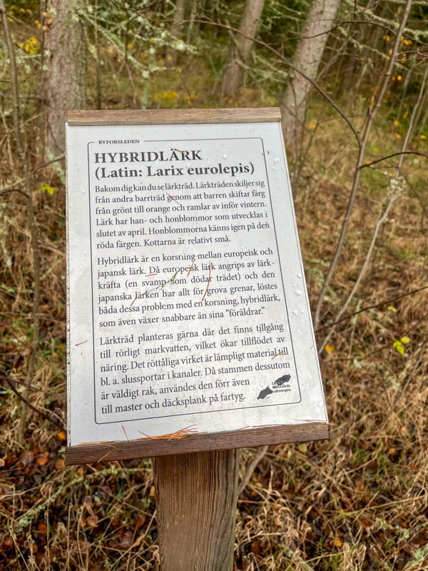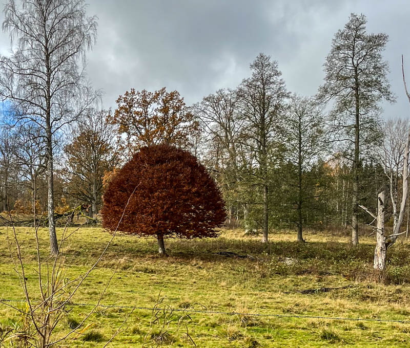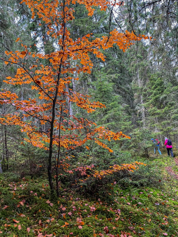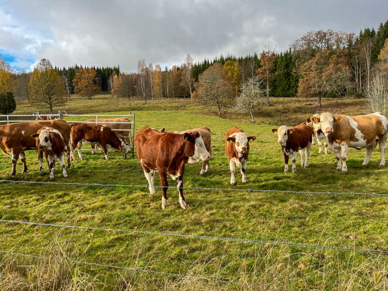 Svampen vi såg är enligt Google frostvaxskivling. Går att äta men bör stkas hårt. Vi gick vägen tillbaka och korna tittade lika mycket på oss som vi på dem. I hagen står en bok som formats av kreatur. Lärk och bok har vackra färger nu.