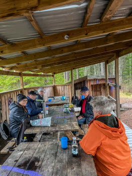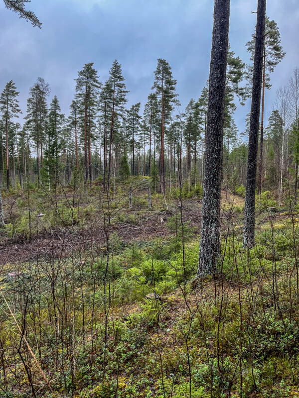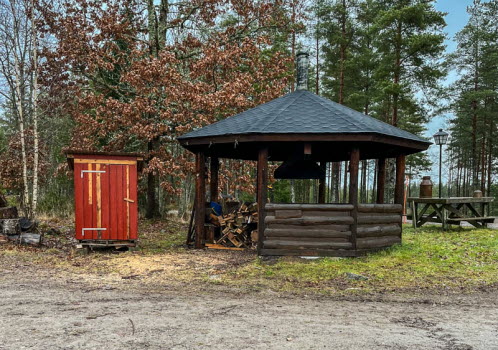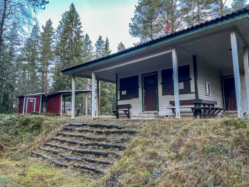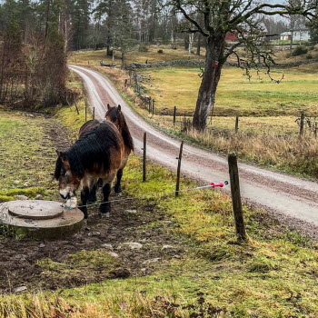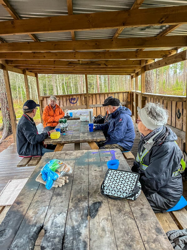 Utgångspunkt denna gång blev skjutbanan. Vi gick genom skogen och fortsatte förbi Svartebacken. Fåglarna har en fin holk och människorna har en större holk för grillning. Hästarna ville hälsa på oss och precis då kom en bil och vi fick flytta på oss. Friluftsfrämjandets basplats blev målet för fikapaus. Där har det utförts lagning av väggarna. De gamla hade använts till brasved. Någon kreaktiv person har försökt dekorera med sprayfärg med mindre lyckat resultat. Jag tycker det är lite för glest mellan träden där. Tillbaka till skjutbanan gick vi via Fisket och vattentäkten.