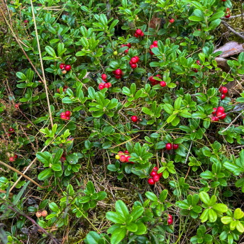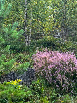 Fika i hagen utan kossor. Ljungen börjar blomma (det var mycket torr ljung i skogen) och det ser ut att bli mycket lingon så vi kanske får plocka lingon i stället för kantareller...