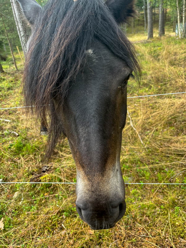 Vi var bara 4 som gick denna gång och det blev knappt 4 km, men vi hade en lugn och fin vandring. Vi startade vid skjutbanan och gick en stig genom skogen till Svartskogen. Inga kantareller men en häst med en liten bläs i pannan. Det står torpskyltar utmed vägen, men eftersom jag inte var vän med telefonen är de knappt läsbara.