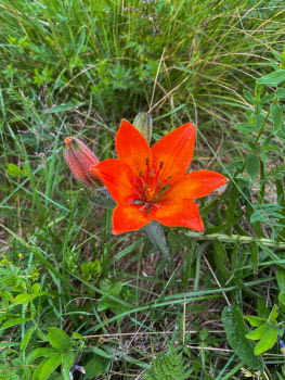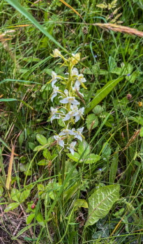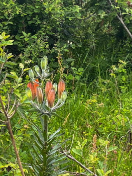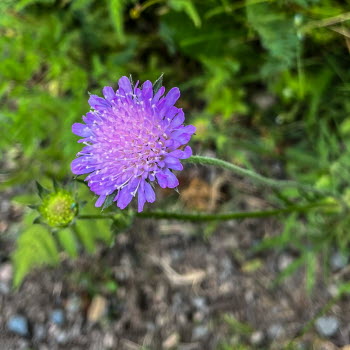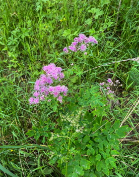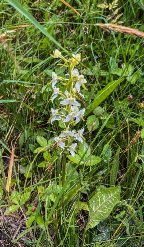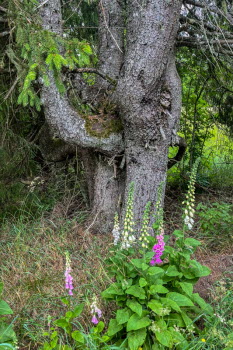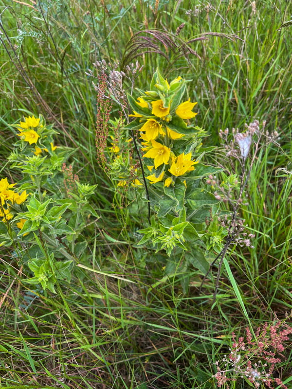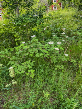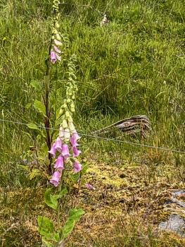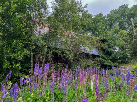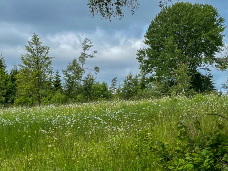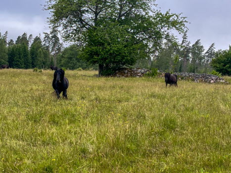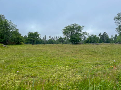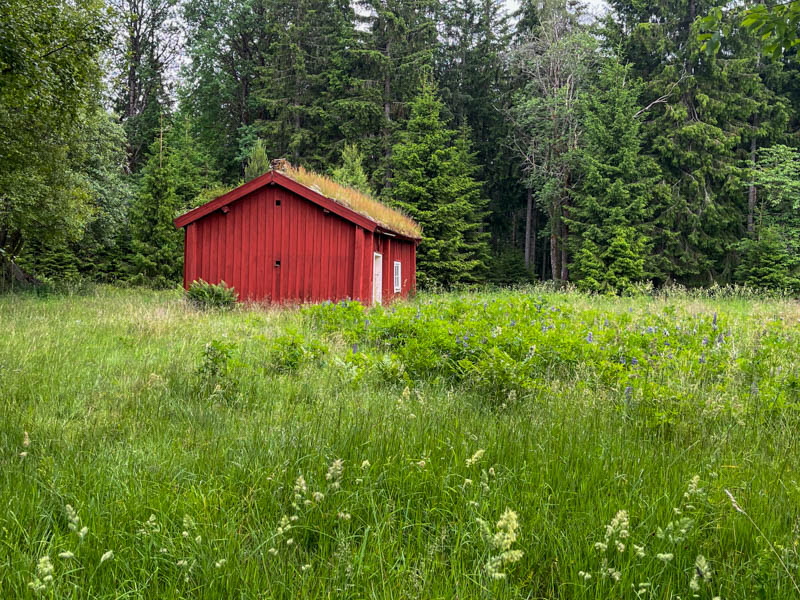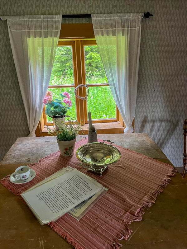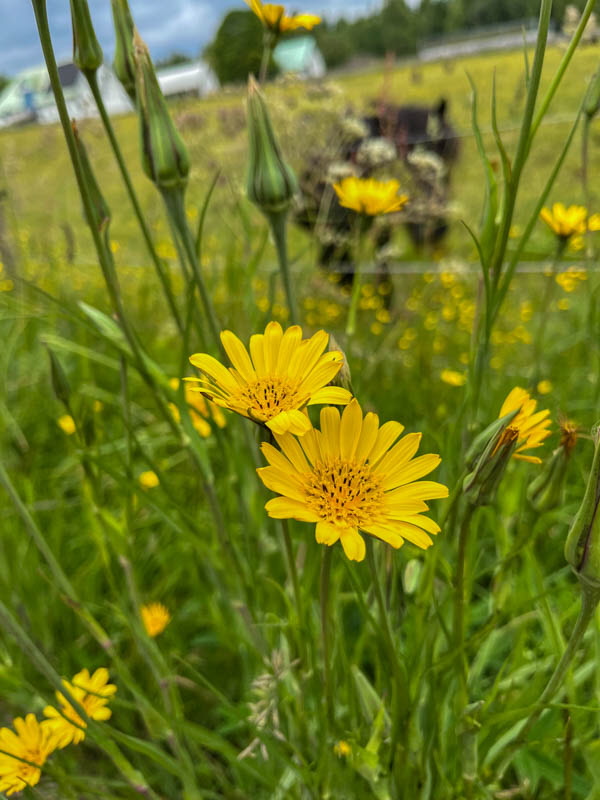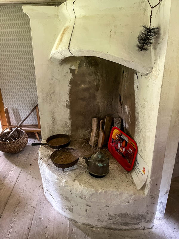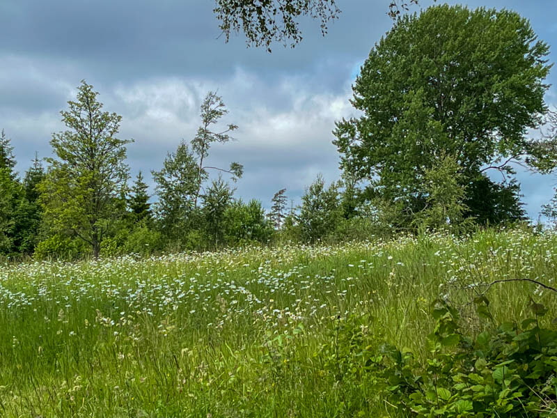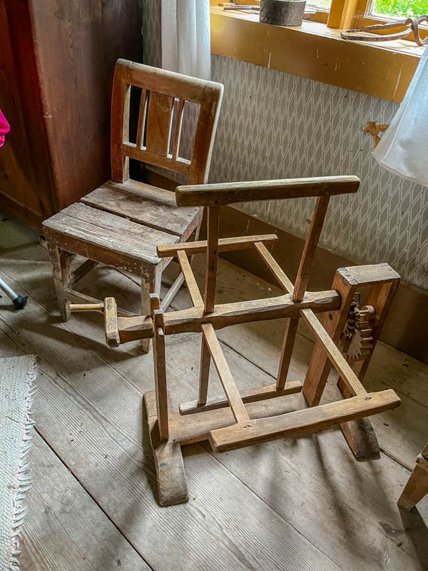 Redskapet på golvet är en härvel, användes för att nysta upp och mäta längden på garn. Vi sneddade över en åker med timotej och luddtåtel. Vid Högaberg var det en äng full med prästkragar. Vid vägkanten såg vi gullhavrerot, en vacker gul blomma.
