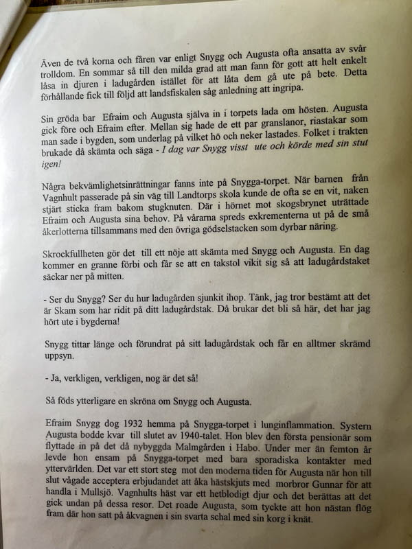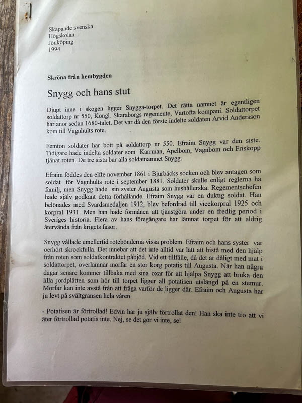 Vi gick från Perstorp mot Vagnhult och fortsatte till det gamla soldattorpet. Det var mycket blommor utmed vägen: brandlilja, videört, fingerborgsblomm, nattvioler stack upp här. Vid Vagnhult fanns aklejruta, olvon och en fyrdelad gran. Ett hus som var väl stöttat av träd. Det syntes knappt. Vi fikade i soldattorpet. Där var det dukat med kaffekopp och kakfat. Den siste soldaten som bodde där hette Efraim Snygg. Hans syster Augusta bodde kvar till 1950 då hon flyttade till Malmgården i Habo.