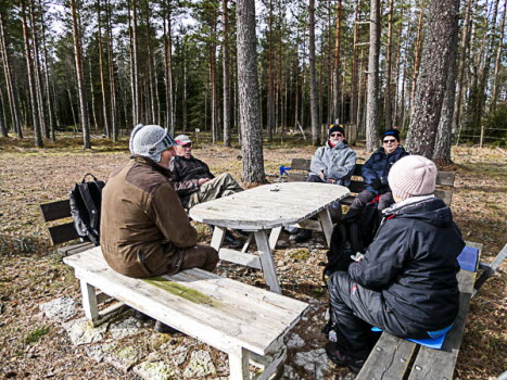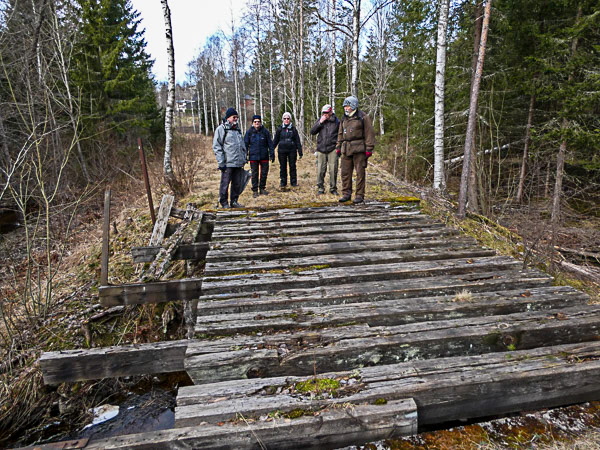 Idag gick vi mot Fisket. Besökte den gamla järnvägsbron över bäcken. Här gick ett stickspår in till ett grustag och så låg där också gamla lokstallar för ånglok. De revs på 70-talet säger den som vet (och det är inte jag). Fikat intogs vid skjutbanan och så besökte vi Friluftsfrämjandets badplats. Det var lite kallt och blåsigt så saven på björkstubben hade frusit. Ärtsoppan fick var och en ta hemma - om de ville! Vi var 6 st och gick ca 5,5 km. Text och bild med hälsning Helena.