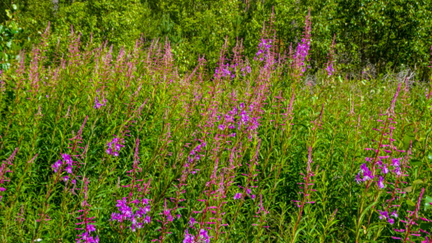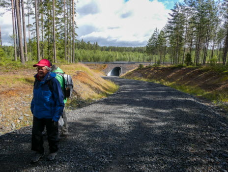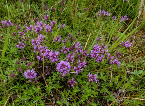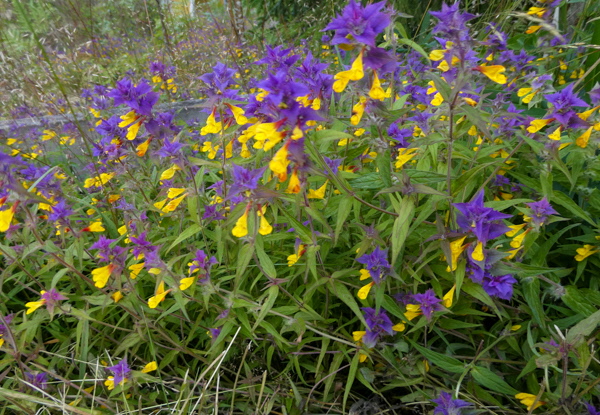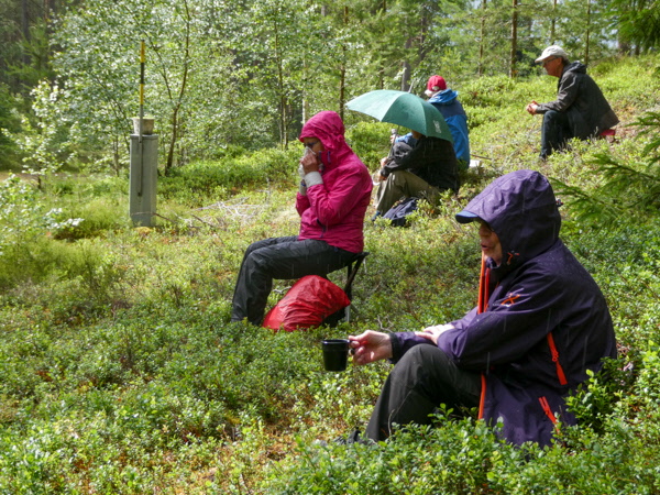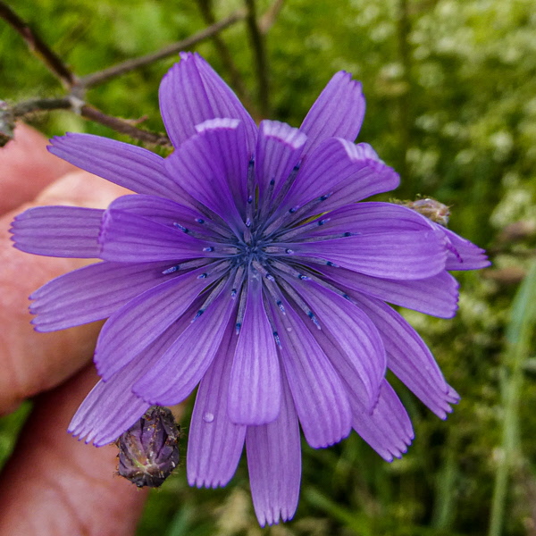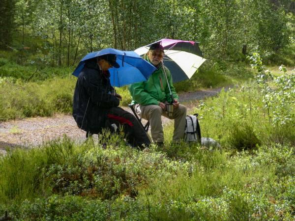 Idag fick vi bara lite regn på oss. Det mesta kom när vi åkte hem. Vi gick från Gruveredsvallen mot Västerkärr. Innan campingen vek vi av mot "Tores stuga", VIP och mot Gruvered igen. Det blev drygt 5 km. Vi var 8 stycken så nu har vi passerat 100 mil totalt. Lite blommor idag: Natt och Dag eller Svenske soldaten, Timjan kan det vara stortimjan? Rallarros och till slut Parksallat med vacker blomma. Under fikat kom det en regnskur och då kom paraplyerna väl till pass. Det blåste rejält också så vi valde lä på rasten. Text och bild med hälsning Helena. _________________________ _PS Parksallat är en invasiv art och ett ogräs som är värre än kirskål, så har ni den i trädgården ska den bekämpas även om den är vacker. Ska inte förväxlas med cikoria. DS