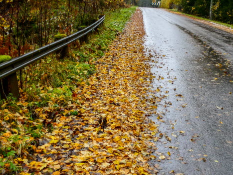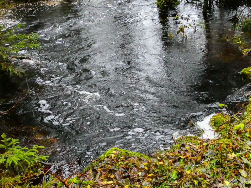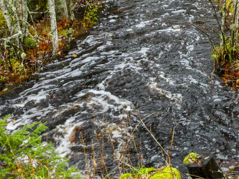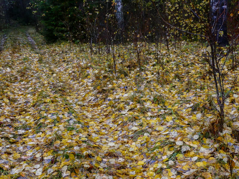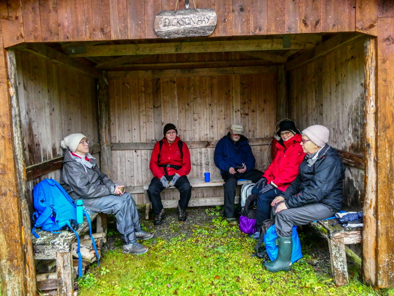 Bäcken har blivit en å och är snart överfull om det fortsätter att regna. Vi fikade vid Dickson Bay - det gäller att hitta fikaställen under tak. Asplöven ligger som en matta.