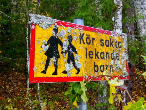 Utmed vägen mot Vasen står en skylt med lekande barn, men de barnen är nog vuxna nu då skylten har mycket lavar.
