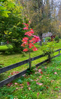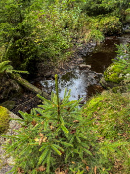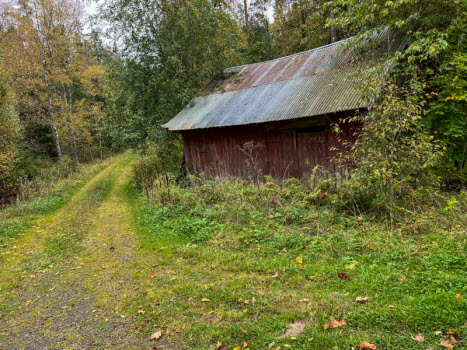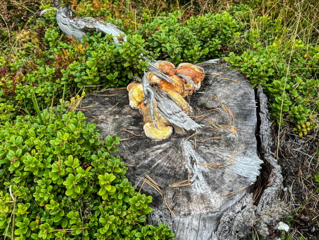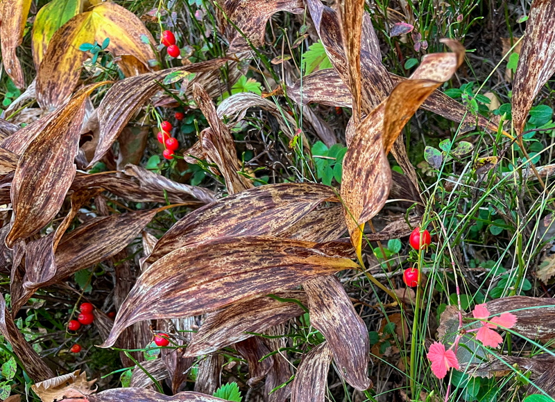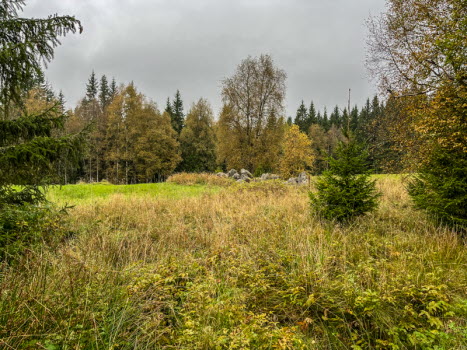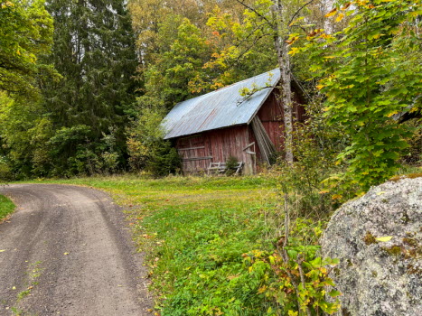 Det märks att det är höst. Liljekonvaljerna har bär med frön. Ganska lite vatten i bäcken som så småningom rinner ut i Knipesjön. Det blir mer höstlikt i landskapet och träden börjar skifta färg. Uthusen ligger vid Sållarehemmet. En svamp av något slag såg vi på en stubbe.