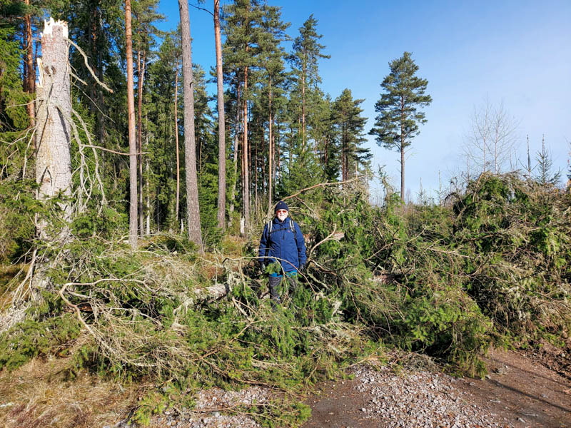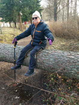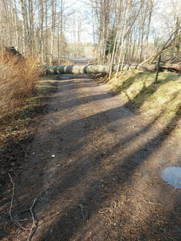 Vi gick från vändplatsen vid Damella och under väg 26/47 mot Helsikekärr. Vi gick aldrig fram utan vek av vid Förråden och tillbaka via kyrkan. Det var ju lite blåsigt och två rejäla hinder på denna sträcka. Det första vid Mabacksvägen och det andra strax innan vägen till båthamnen. Sista rotvältan var vid kyrkan. Fanns även kvar lite av snön som föll inatt. Blev totalt 4 km fikade gjorde vi hemma.