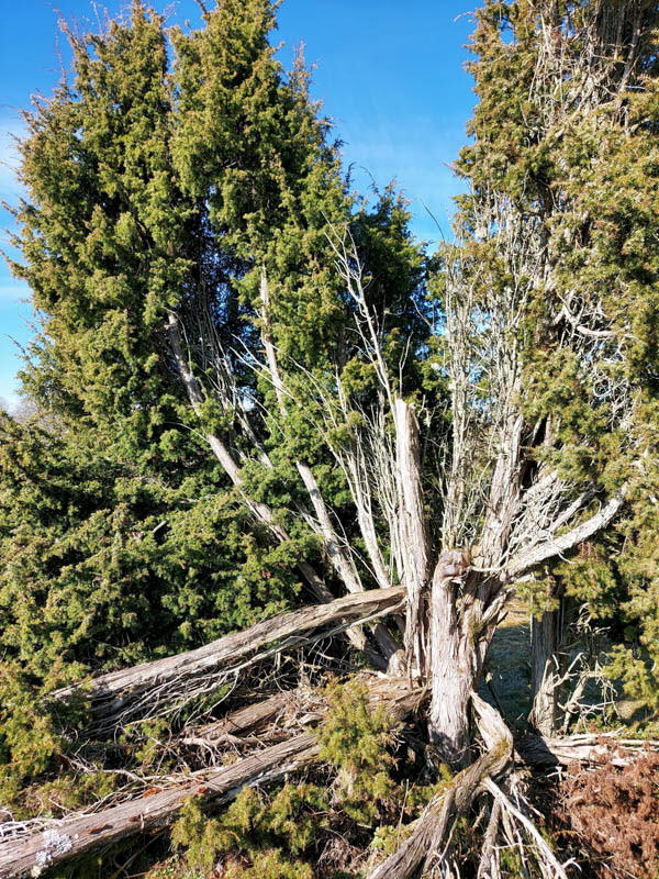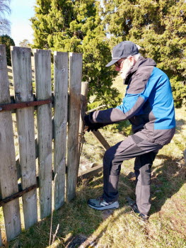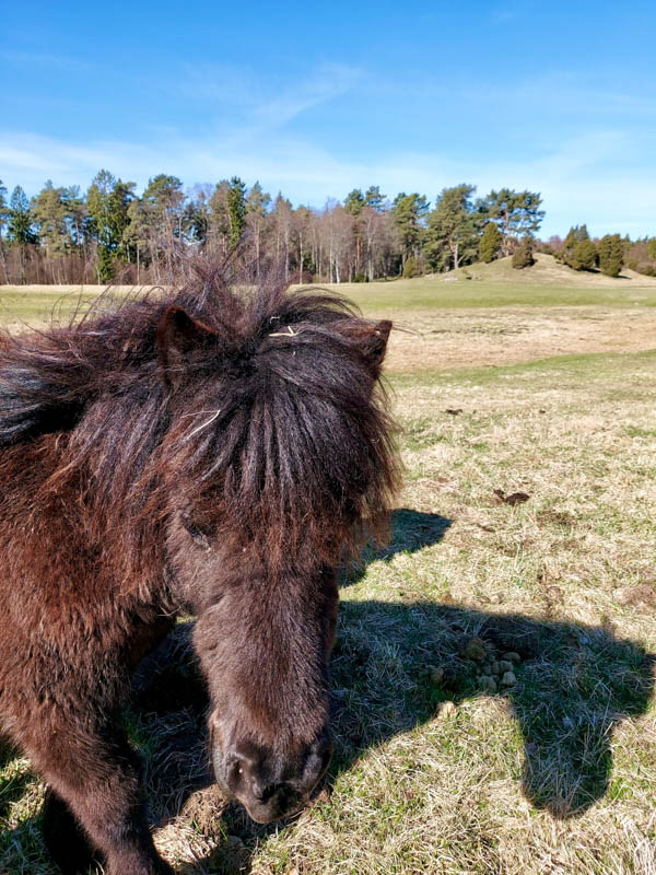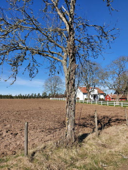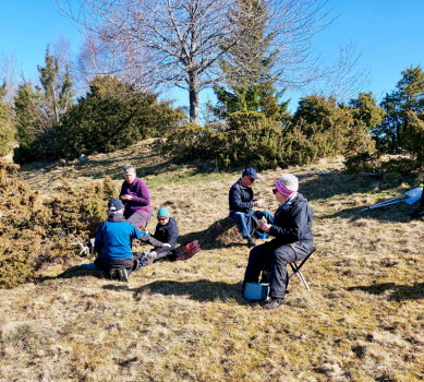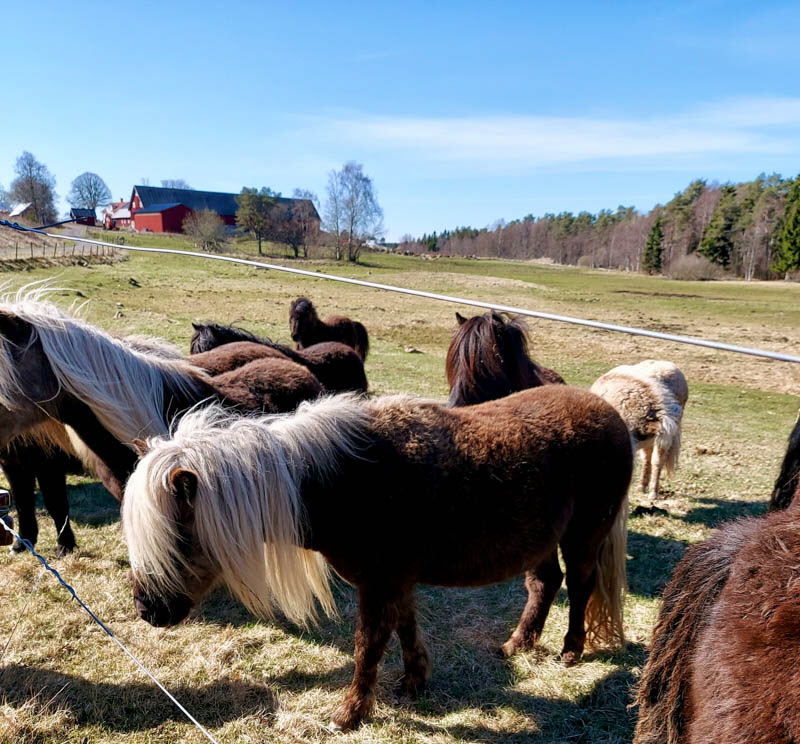 Vandringen idag gick till Ljunghemsbackar för att kolla på Backsippan. Det var inte rikligt av dem men det blev några bilder. Kostigar fanns det flera att välja på. Myrorna hade vaknat till liv på en liten stack och som vanligt fanns det gott om Enar. En bild visar att Enar är av segt virke liksom Björk. Rickard skötte sig och var grindvakt på en plats. Fika blev det med utsikt och på vägen tillbaka såg vi stockar som var märkta med blått streck eller en blå punkt i änden, vad det skall betyda? 16 nyfikna ponnys kom fram och skyltar till resp gård fanns också.