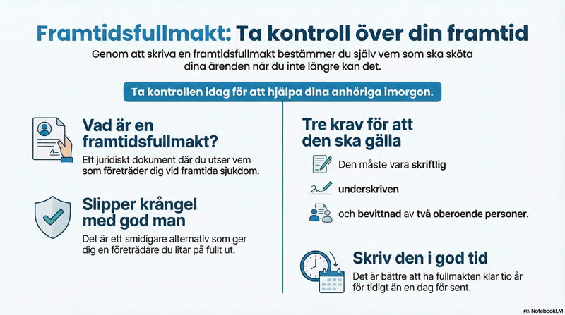 Vad händer om du en dag inte längre kan sköta din ekonomi eller ta beslut om din personliga omvårdnad? Genom att skriva en framtidsfullmakt tar du kontrollen över din framtid redan nu. Det är en gåva till dig själv – och en stor hjälp för dina anhöriga.