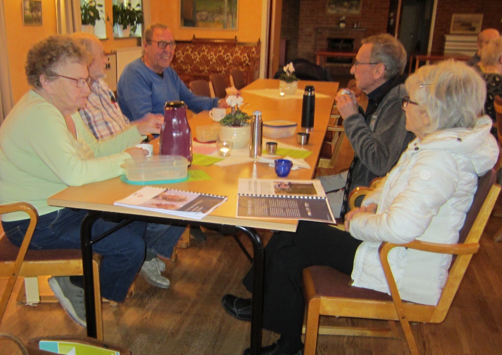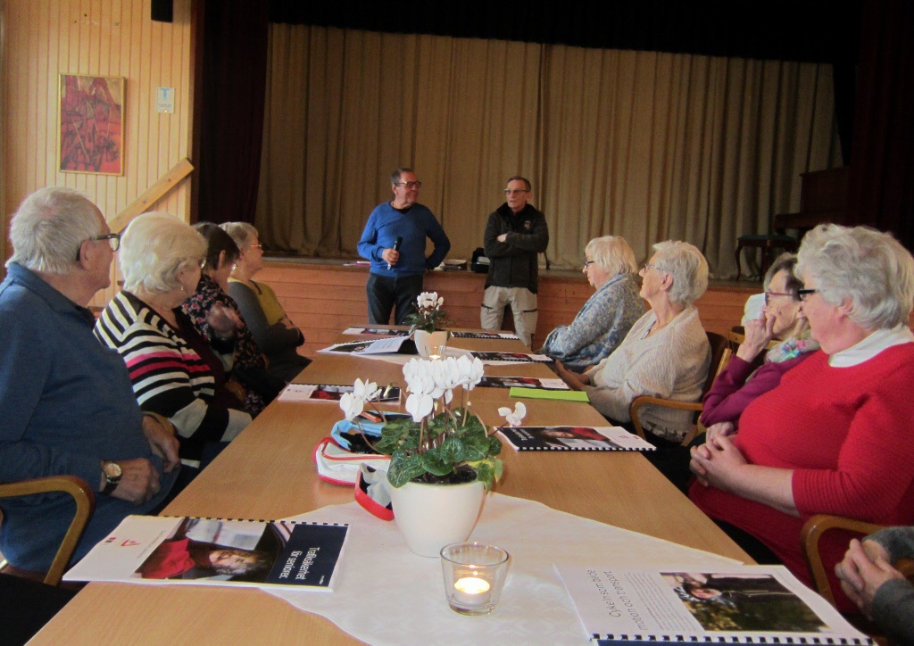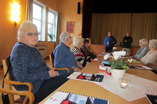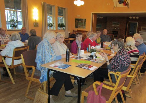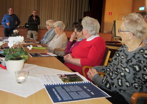 Inge Andersson som cirkelledare i bygdegården vid studiecirkeln trafik för äldre. Inbjuden gäst var Christer Carlstén som berättade om sitt liv som yrkestrafikant.