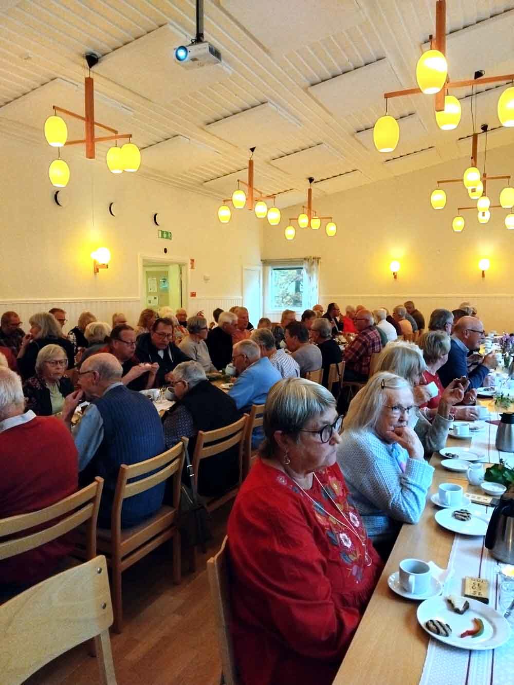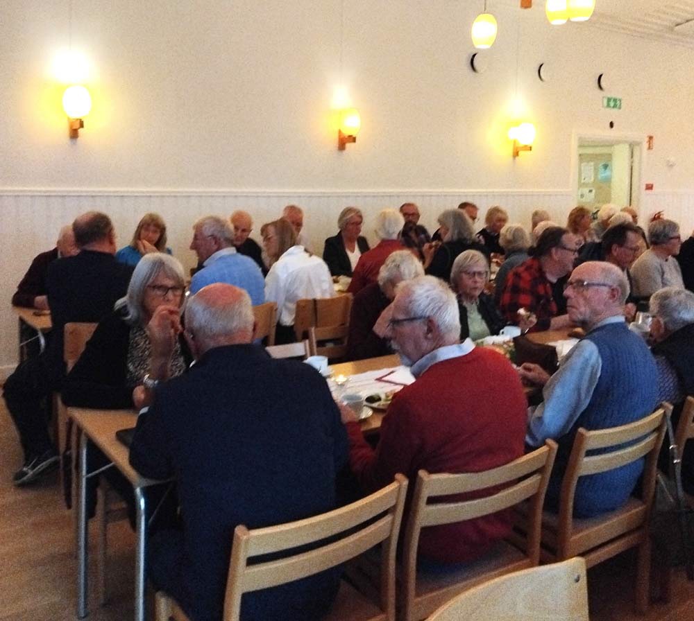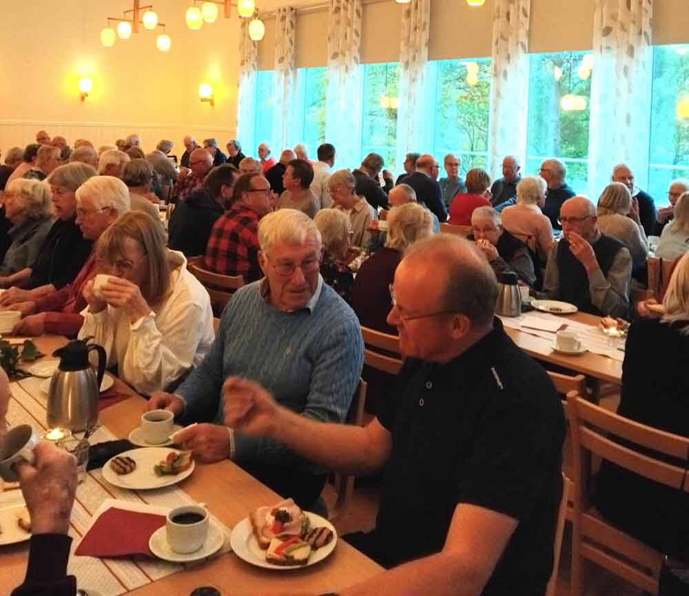 Naturen sprakade av höstfärger och inne i bygdegården väntade vackert dekorerade kaffebord på de 90 deltagare som kommit för att lyssna på dagens gäst. Det var en bygdens son, Ingemar Arvidsson, född och uppvuxen i Hjälmåkra, Myresjö. Han är känd som förbundskapten och generalsekreterare för det svenska skidskyttelandslaget och hade mycket att berätta, allt från en blygsam början till dagens elitåkares framgångar. En fantastisk arbetsinsats för svensk skidsport. Ingvar Andersson tackade och överlämnade blommor och publiken visade sin uppskattning med varma applåder. Därefter var det dags för kaffe och goda smörgåsar, som Nävelsjö-gruppen hade ordnat. Sedan underhöll SPF-kören med några sånger. Yvonne Svensson rapporterade från KPR, bl.a. om konsumentvägledning. Birgitta informerade om Senior Shop, som kommer till Brobygården 5 november. Lawrence och Gunnel höll i dragning på friskvårdskorten och därefter blev det dragning på lotterierna. Som vanligt var det många som gick hem med fina vinster. Birgitta avlutade med att tacka alla som medverkat och alla som kommit och inbjöd till nästa träff i Årset 12 november.