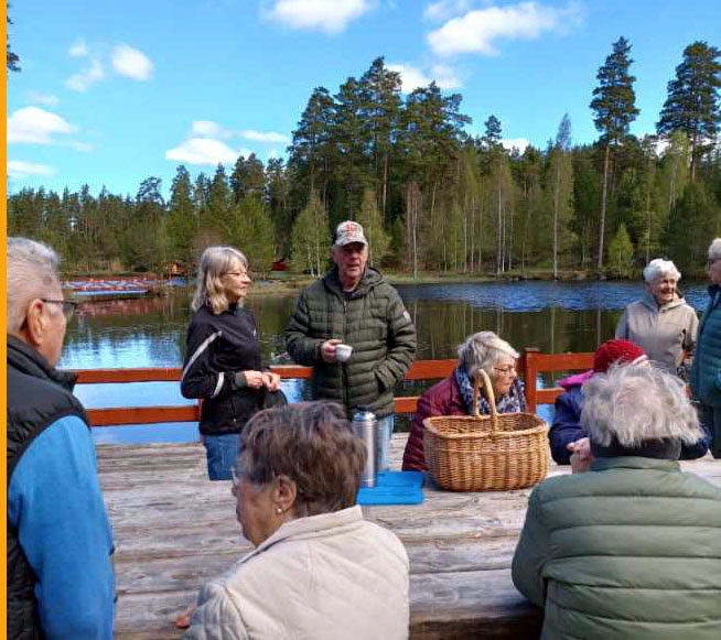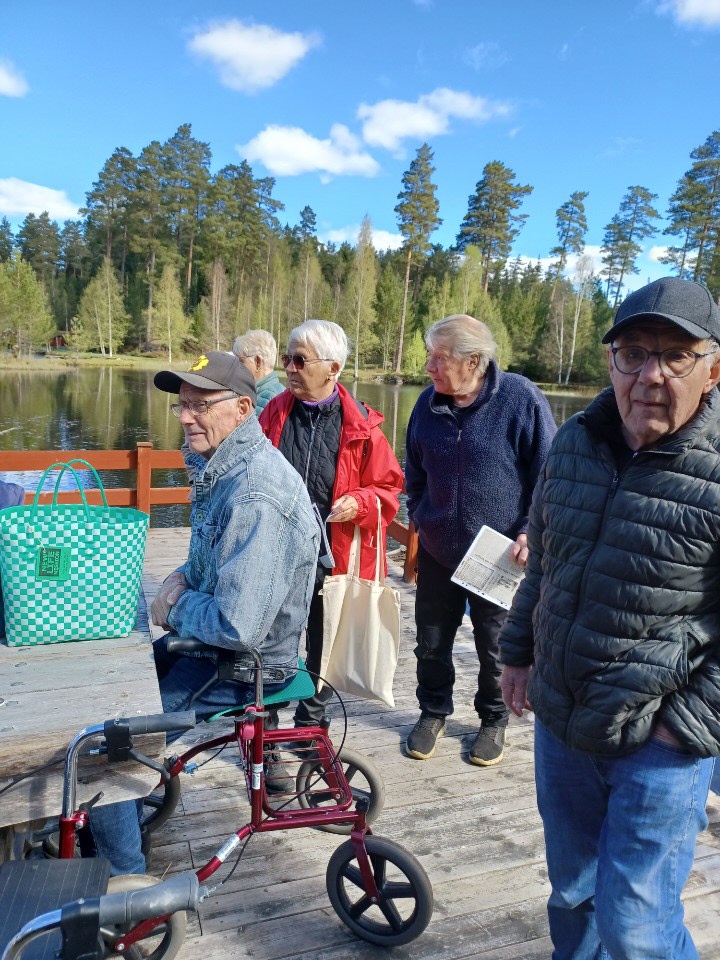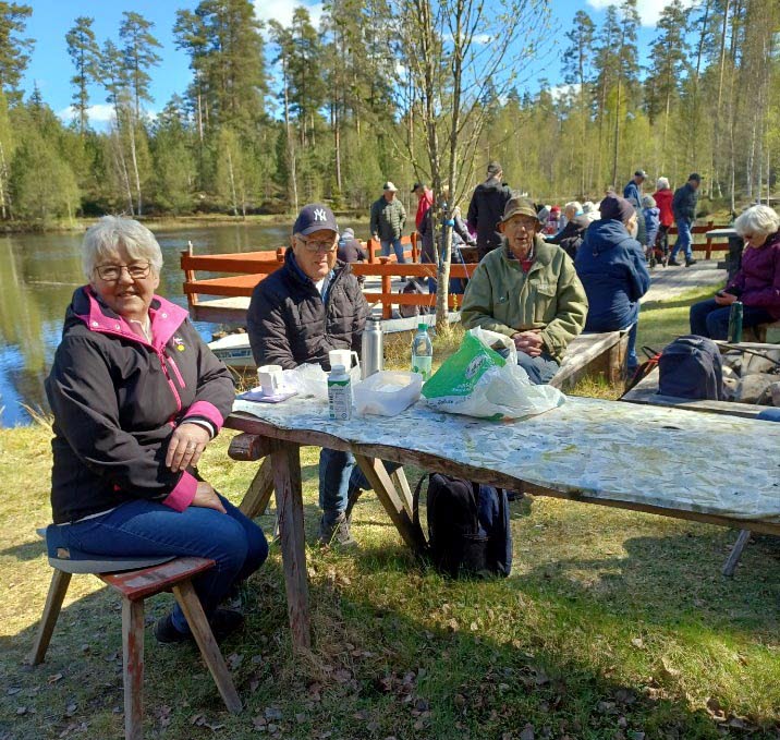 Där vävs mattor, dukar, kuddar och även delar till hembygdsdräkter. Ulla-Britt har 6 vävstolar, där den som är intresserad, kan få sätta upp sin egen väv. Sedan gick promenaden ner till Tony Gunderséns fiskdammar. Där finns 8 stugor. I fiskdammarna finns laxöring och regnbåge. Det finns möjlighet att köpa fiskekort och hyra någon av stugorna, i härligt skön Smålandsmiljö. Efter information om stugbyn intogs medhavt kaffe i strålande solsken. Ansvariga för vandringen var Majvor Andersson och Roland Axelsson. Den senare tackade värdarna för intressanta visningar.
