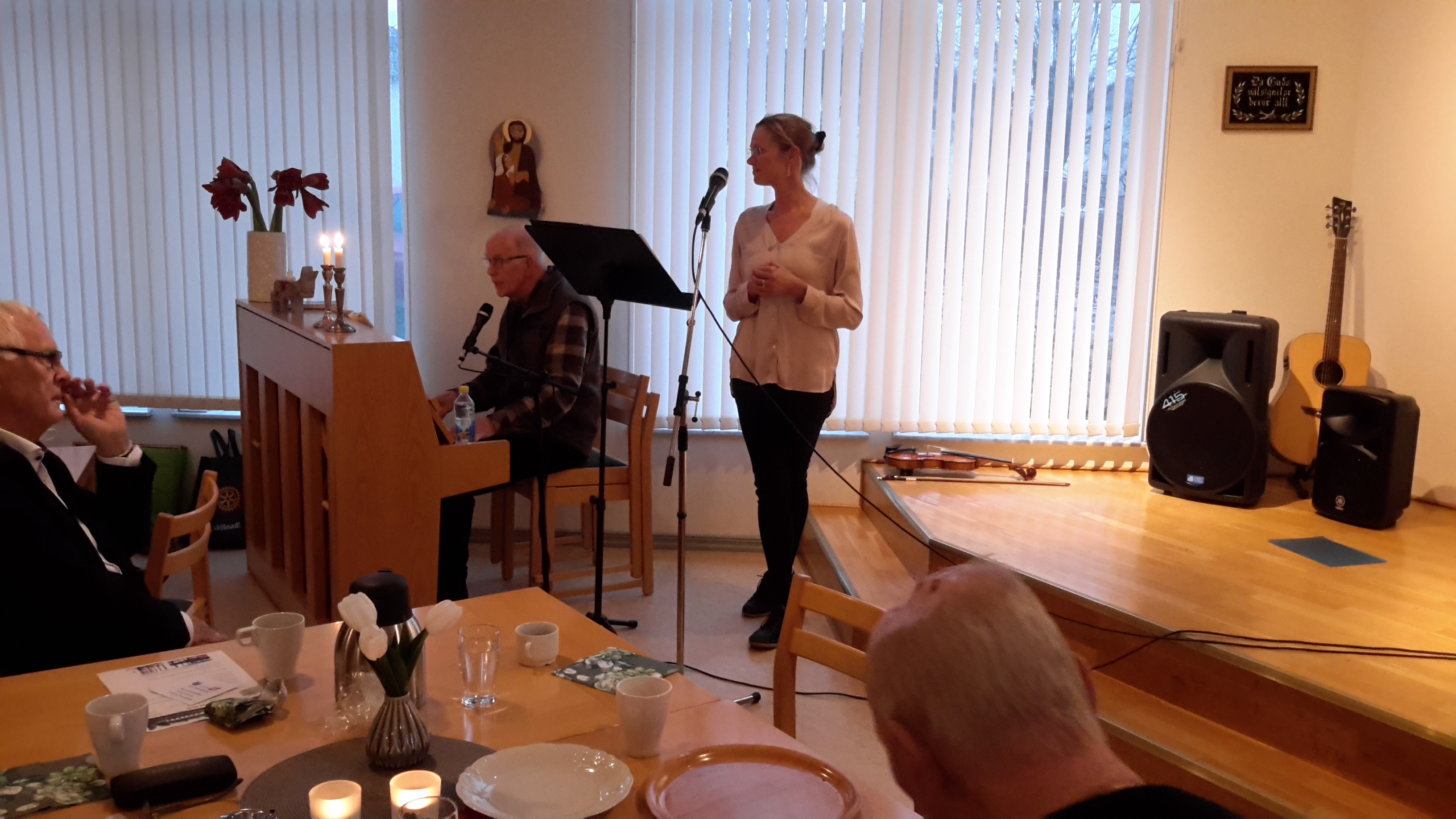 Charlotte Felli Crona och Lindor Linden gav sedan prov på sina musikaliska färdigheter. Charlotte en fantastisk violinist men också en mycket duktig sångerska fick oss att njuta under en stund där de tillsammans framförde flera kända stycken som spelades upp på ett personligt sätt. Alla rycktes med och föll in i sången där vi kunde. Ett mycket uppskattat framförande som gav varma applåder och muntra tillrop.