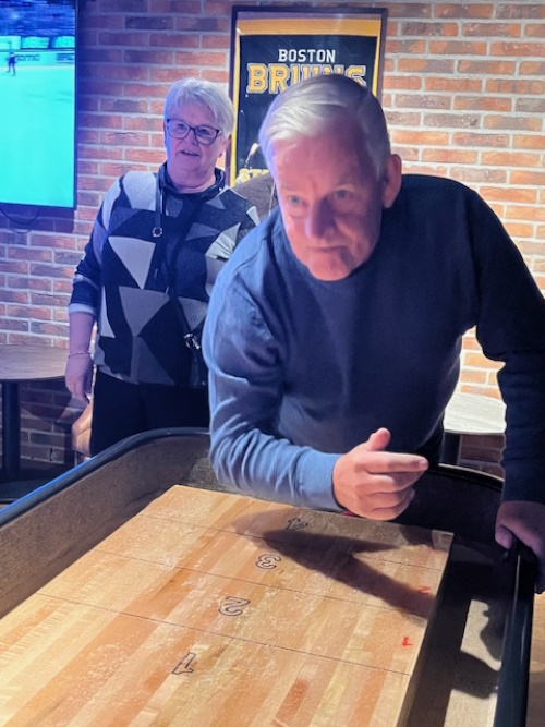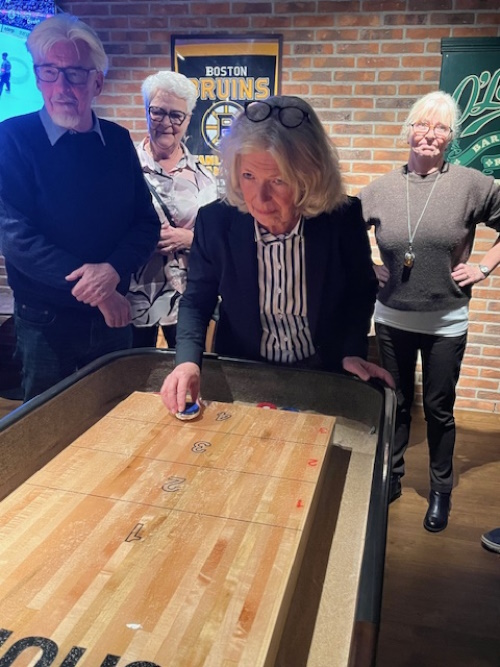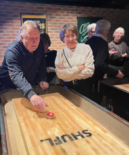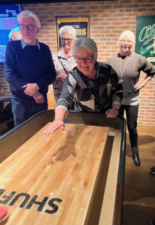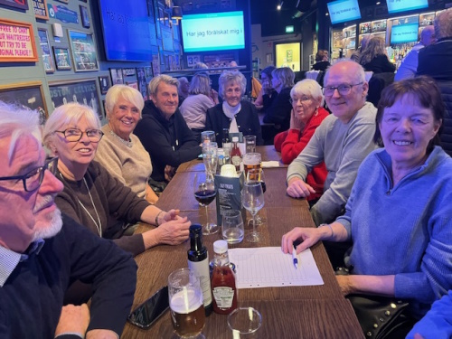 Det blev en kväll fylld av skratt, laganda och musik när vi träffades på O´Learys för schnitzelfest. Kvällen inleddes med att vi samlades runt borden för att avnjuta en god schnitzel med tillbehör. Efter middagen var det dags för kvällens kreativa utmaning, ett musikquiz. Vi fick korta textrader från svenska låtar och uppgiften var att sätta rätt namn på låtarna. Lagen delades in bord för bord. Melodier hummades, textrader diskuterades och gissningar for fram i snabb takt. Några låtar kändes igen direkt med andra var mera svårlösta. Kvällen avslutades med en shuffleboard tävling. Deltagarna delades in i lag om fyra personer i varje lag. Hejaropen ljöd, tävlingsivern tog snabbt fart och spänningen steg för att se vilket lag som tog hem segern. Segrande lag blev Elisabeth Henriksson, Yvonne Bokor, Anders Bladh och Percy Curhed. Stort grattis till dem.