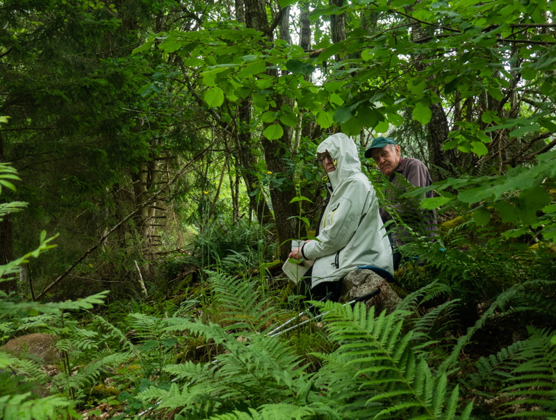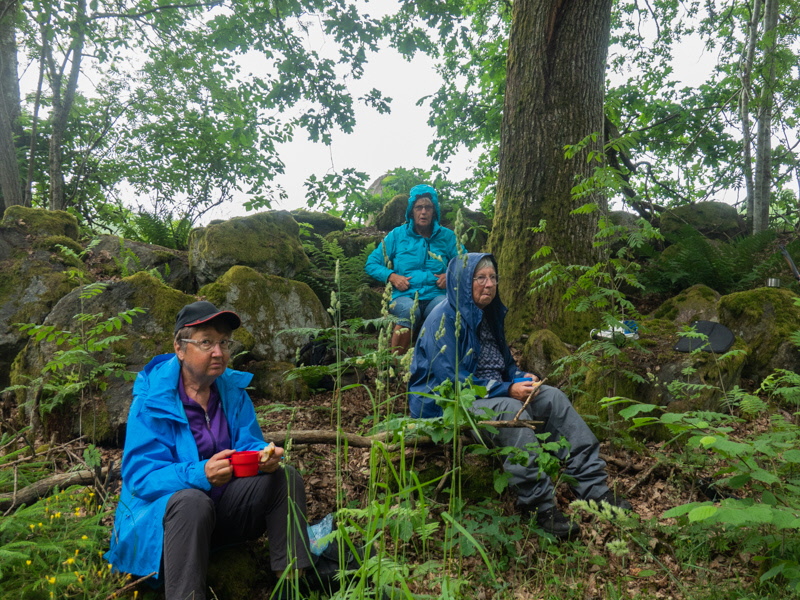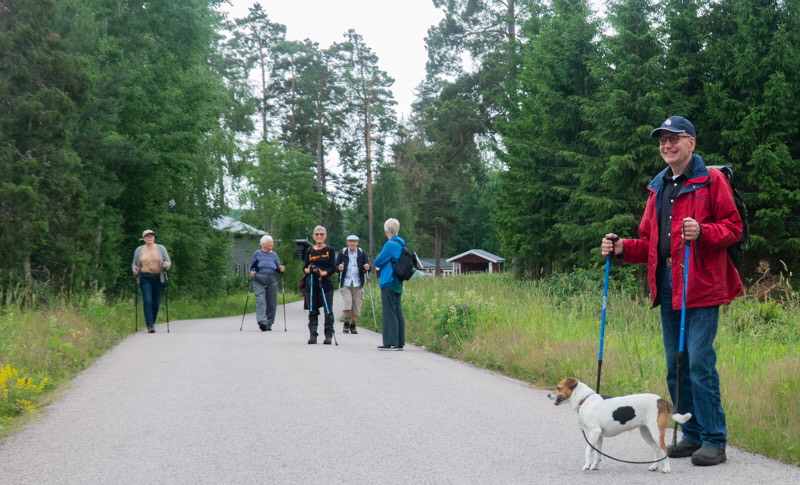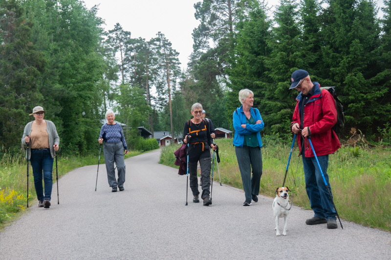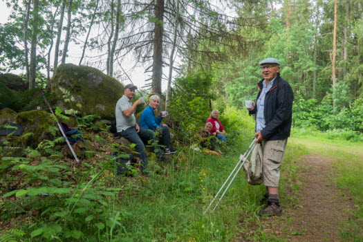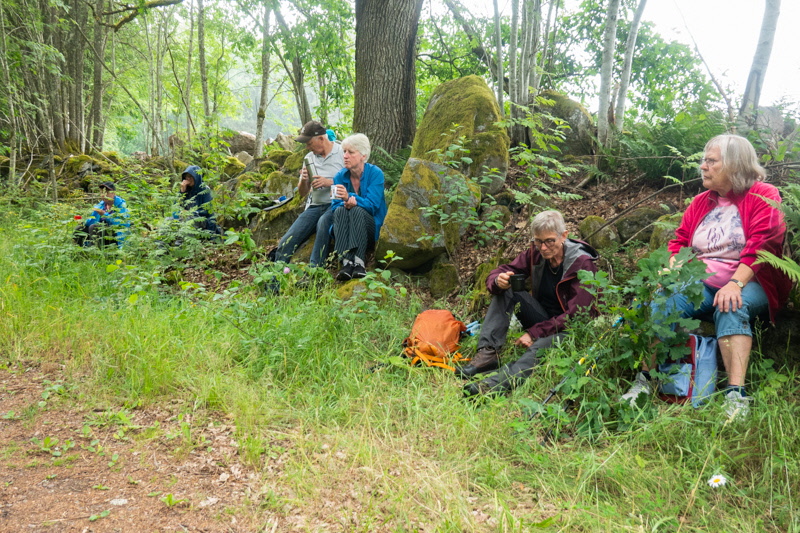 30 juni. Samling vid Missionskyrkan. Regn hotade, men promenaden genom Ekenässjön ned mot badplatsen gick utan att vi blev blöta. Vi vandrade vidare upp mot Sjöarp i södra delen av sjön. Vi gick Trollstigen. Barnen i kyrkans barntimma har gjort små troll och placerat ut utefter stigen. När det blev dags för fika kom regnet och vi tog skydd under några stora träd. Vägen tillbaka gick utefter Bo-vägen och vidare bort mot Östergården.