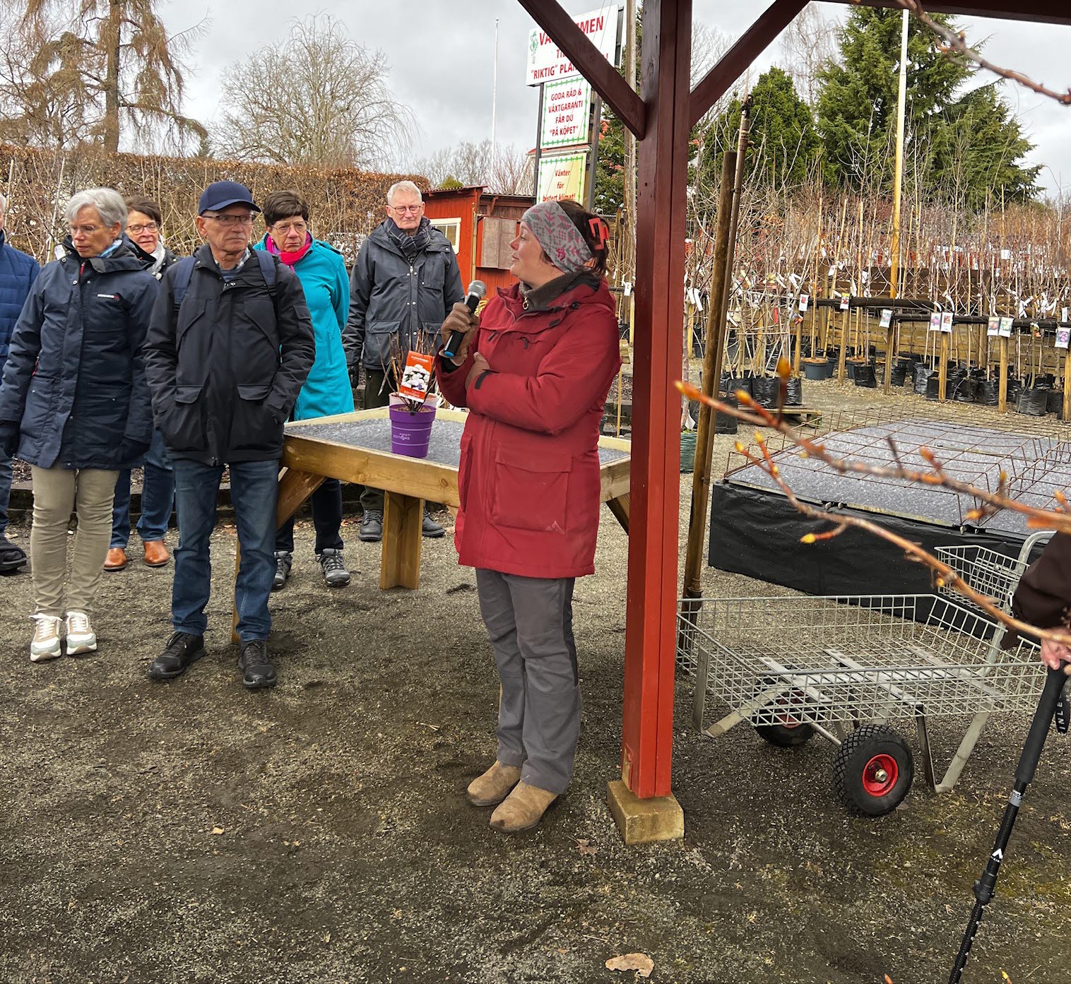 Kajsa kunde hälsa närmare trettio trädgårdsintresserade och blomsterälskande seniorer välkomna och började med en intressant tillbakablick över företagets historik. Sedan var det dags att presentera årets nykomlingar inom plantor och andra växter. Kajsa började med årets pelargon och den har fått namnet Hilma. Denna växt fick senare en strykande åtgång bland de köpsugna gästerna. En ros, kallad Agda, som har fått tillnamnet honungsros, presenterades och även olika sorters nya hortensior. Vad är en jordgubbshallon, det kan man fråga sig men nu finns denna växt att köpa, ursprungligen uppodlad i Ålaryd. ”Hur smakar bären?” Ja, det finns inget direkt svar. Penséer är alltid populära vid denna årstid och det visades olika färger, med de persikofärgade som mest populära.