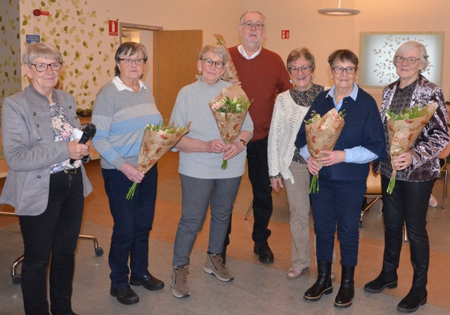 Vid avtackningen syns från vänster Solbritt Gustavsson, Birgitta Liedholm Gustavsson, Ulla-Britt Lilja, Jan Samson, Boel Lago, Monica Johansson och Inger Axelsson.