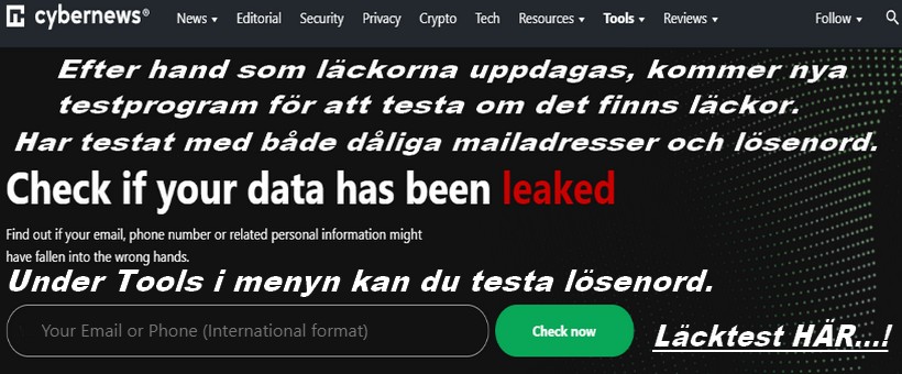 Här kan du se om din email och dina lösenord är synliga för obehöriga. Läs gärna under Cybernews och se alla läckor och konstigheter som finns. Om du använder Brave och inte svensk VPN, använd översättaren i Brave.
