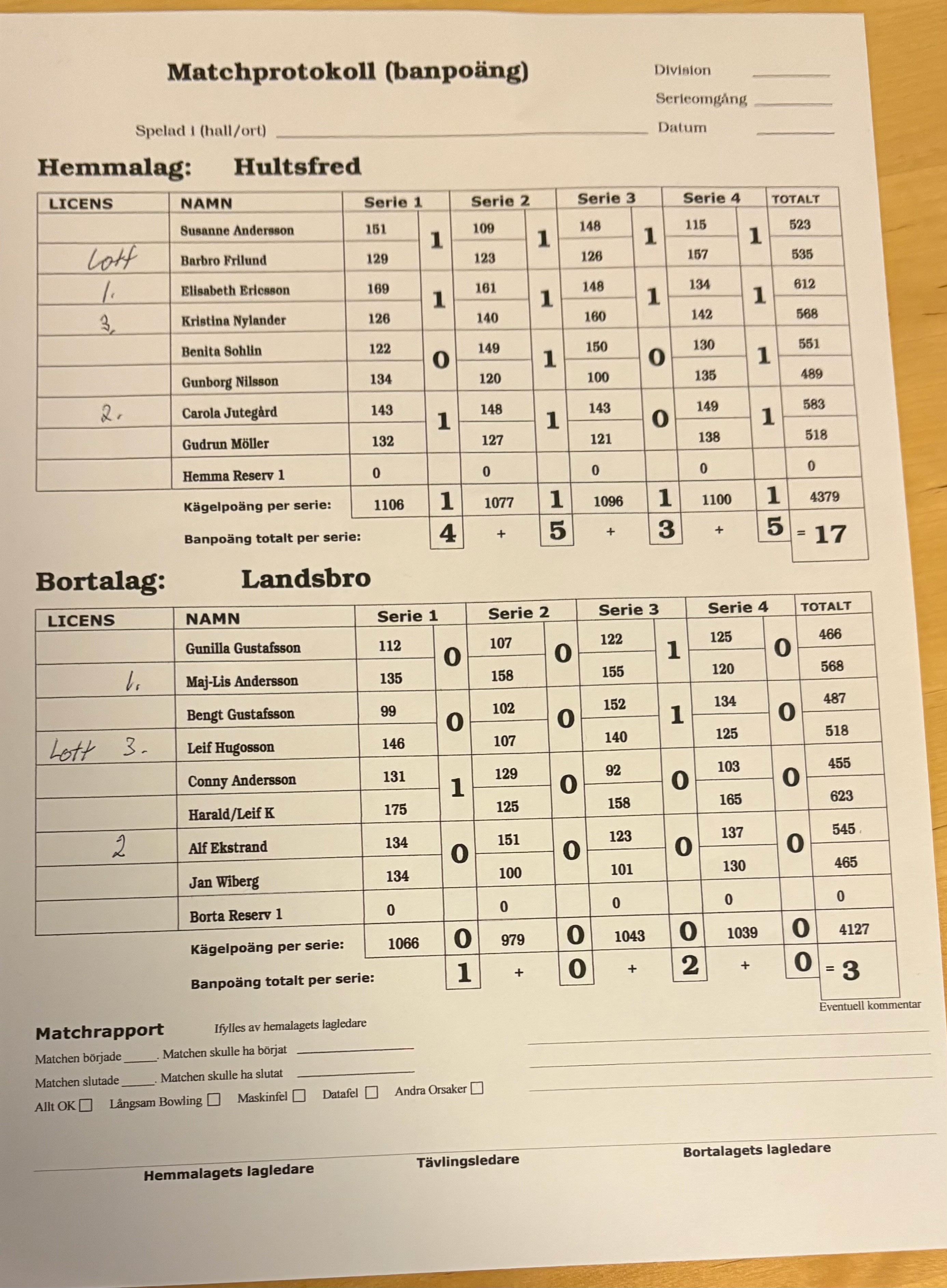Bästa dam i Landsbro, som för övrigt hade ett mixat lag, var Maj-Lis Andersson 568 poäng och bäst i Hultsfred var Elisabeth Ericsson 612 poäng.