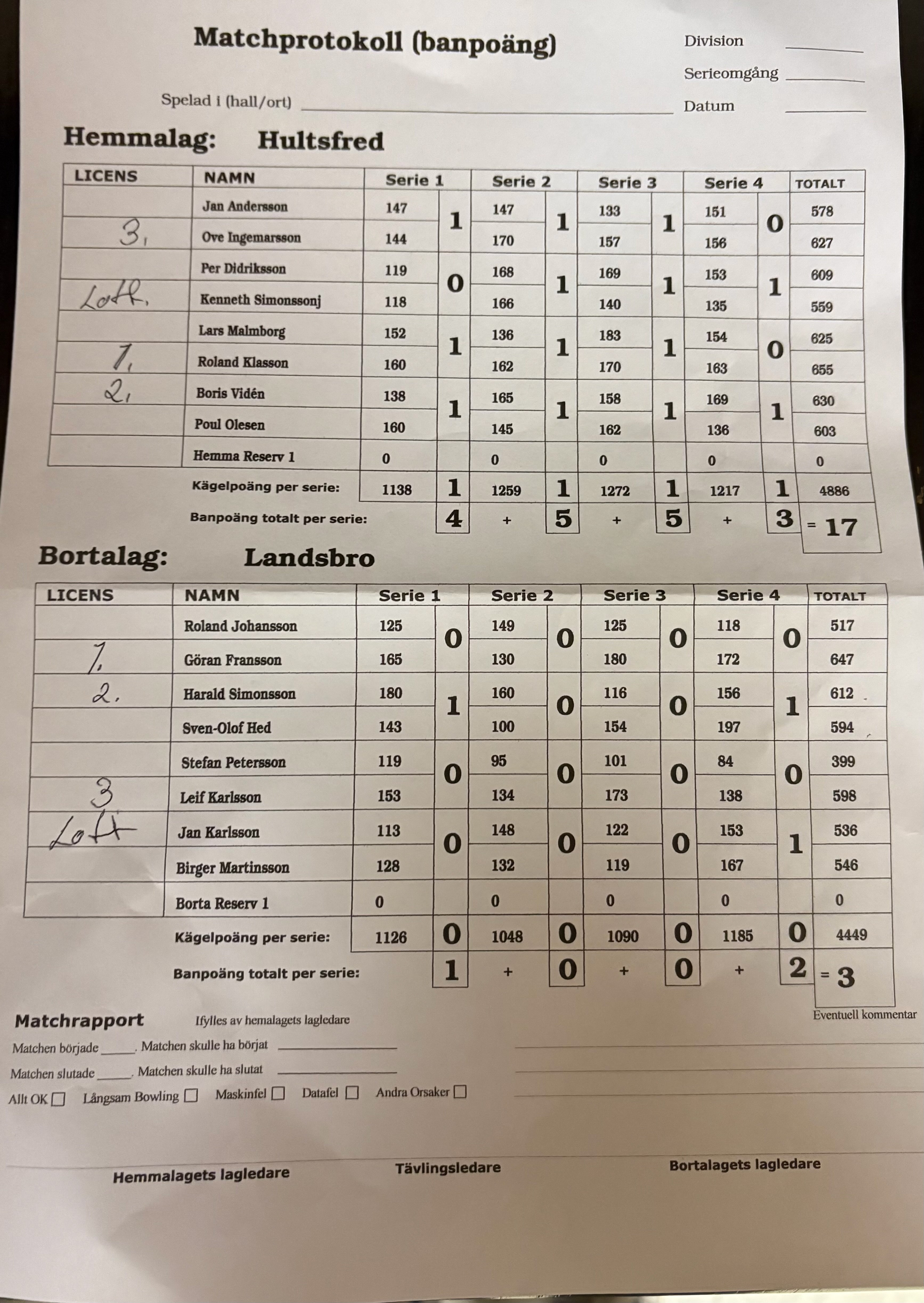 Bäst bland herrarna i Landsbro var åldermannen Göran Fransson 647 poäng och bäst i Hultsfred var Roland Klasson 655 poäng.