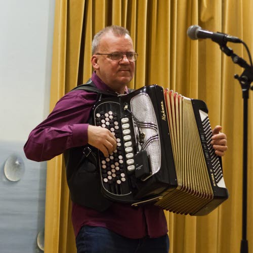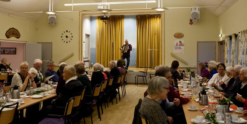 Servering av kaffe med smörgås och kaka. Under fikat underhöll Stefan Alfredsson med dragspelsmusik.
