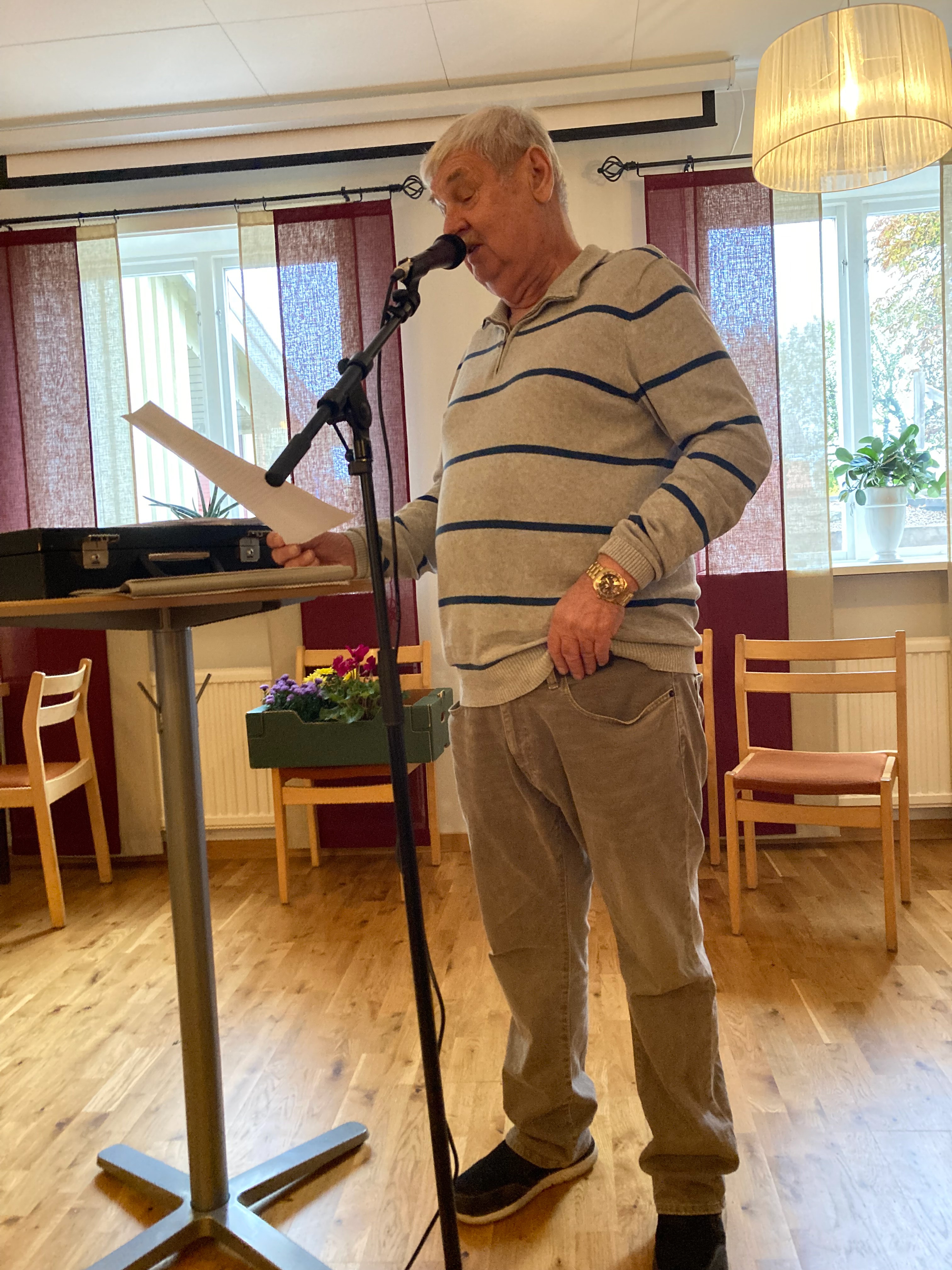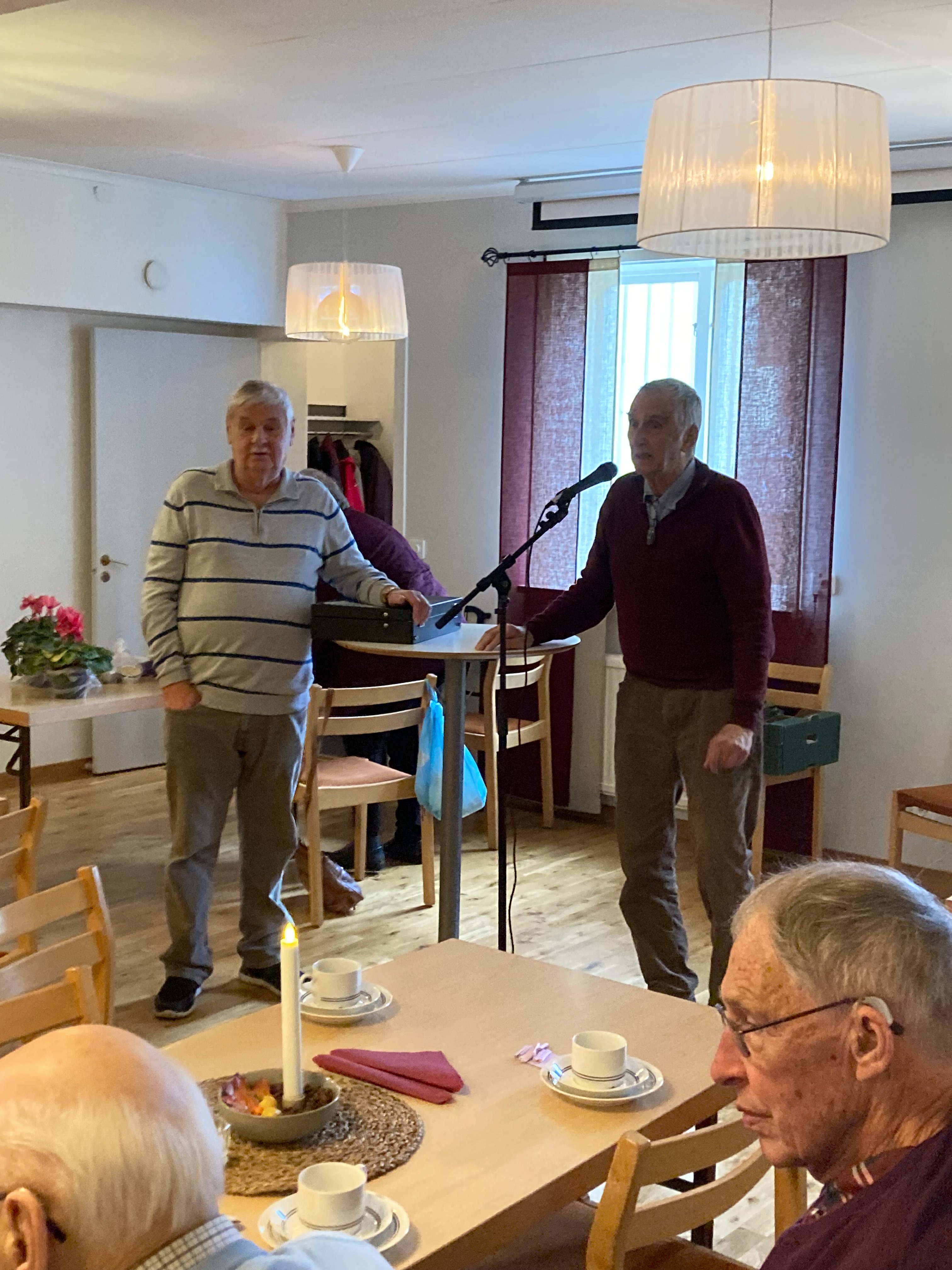 Ordförande Lennart hälsar Christer G Slätt välkommen till månadsmötet -
