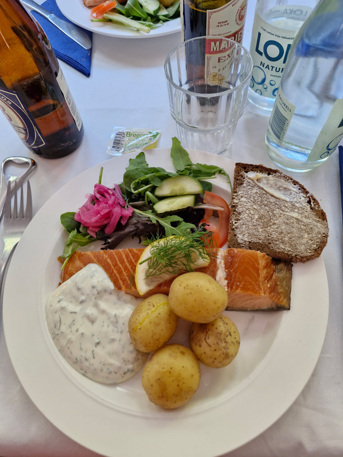 Vi behövde inte gå hungriga. Kaffe och fralla på kajen och lax på båten.