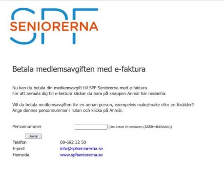 Om du har Internetbank kan du anmäla e-faktura för betalning av medlemsavgift till SPF Seniorerna Knutpunkten. Det innebär att du får din avi som e-faktura. Då slipper du att hålla reda på inbetalningskortet och behöver inte heller fylla i ett långt OCR-nummer när du betalar. Dessutom hjälper du till att spara pengar åt SPF Seniorerna, samtidigt som miljön mår bättre av att vi skickar ut så få pappersfakturor som möjligt.