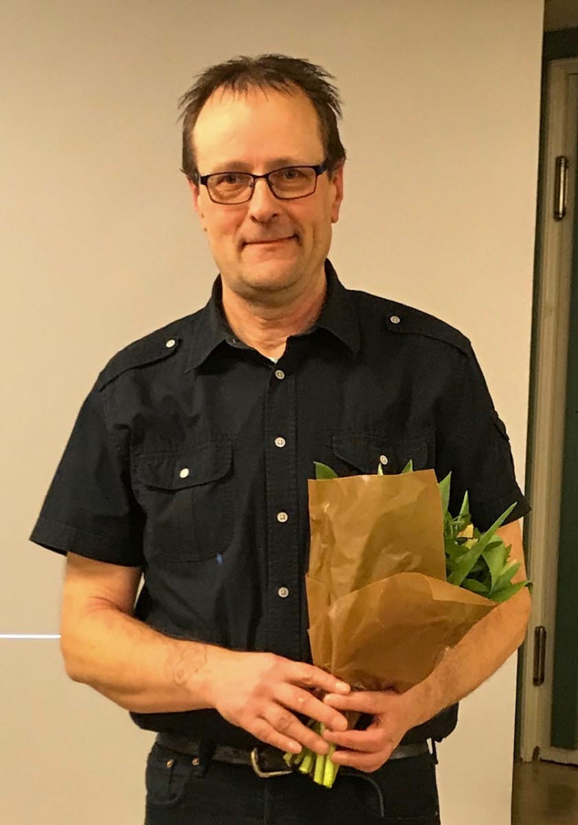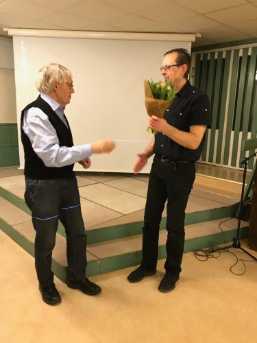 Ordföranden Jan Claeson överlämnar en vårlig tulpanbukett och