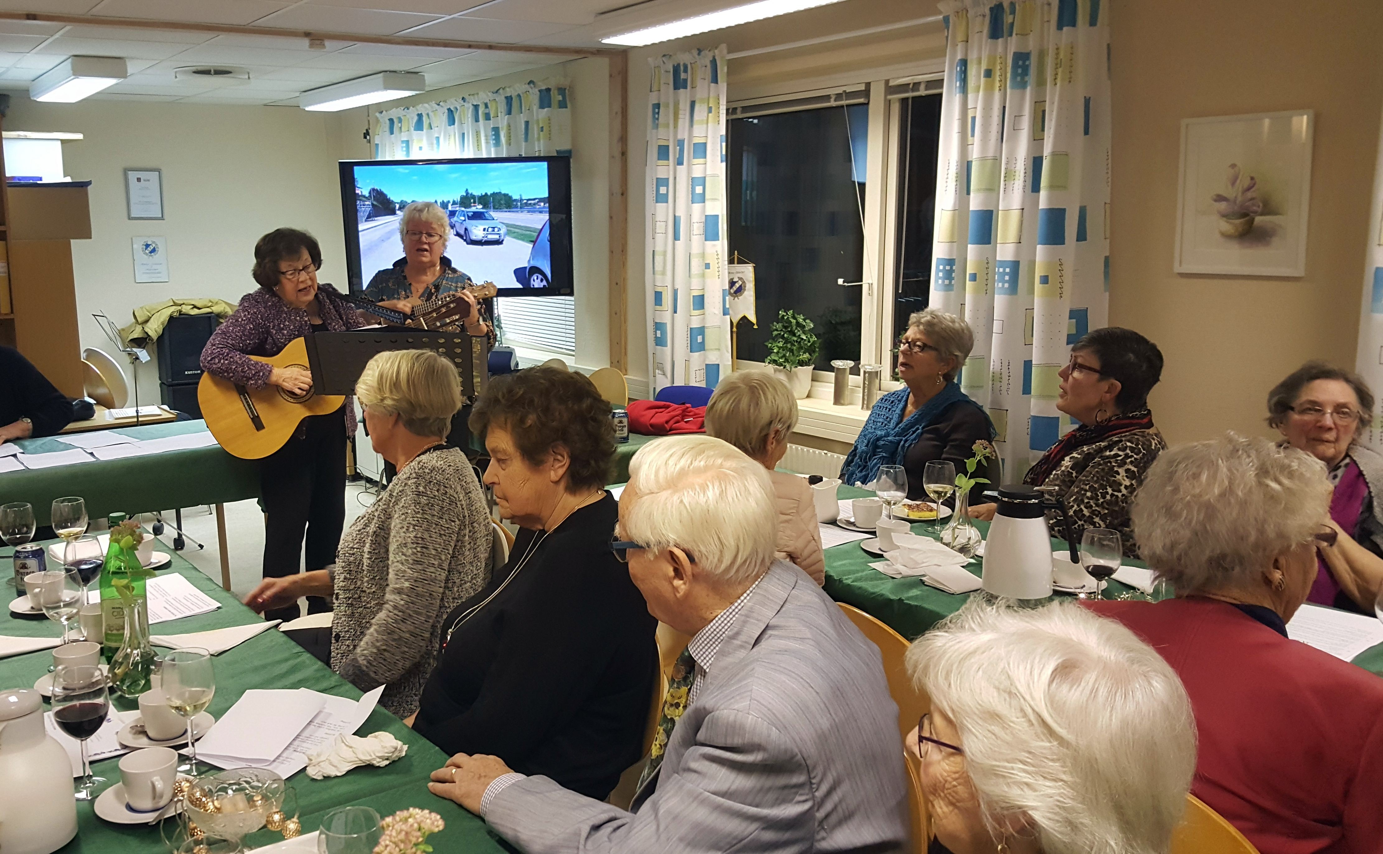 I pausen mellan middag och kaffe var det underhållning av SPF:s sångfåglar Margaretha Scarstedt-Andersson och Helena Proba, som med sina gitarrer stämde upp till allsång med musik av Sven-Ingvars och som avslutning inför den stundande julen, ett knippe kända julvisor. Mycket underhållande och uppskattat !