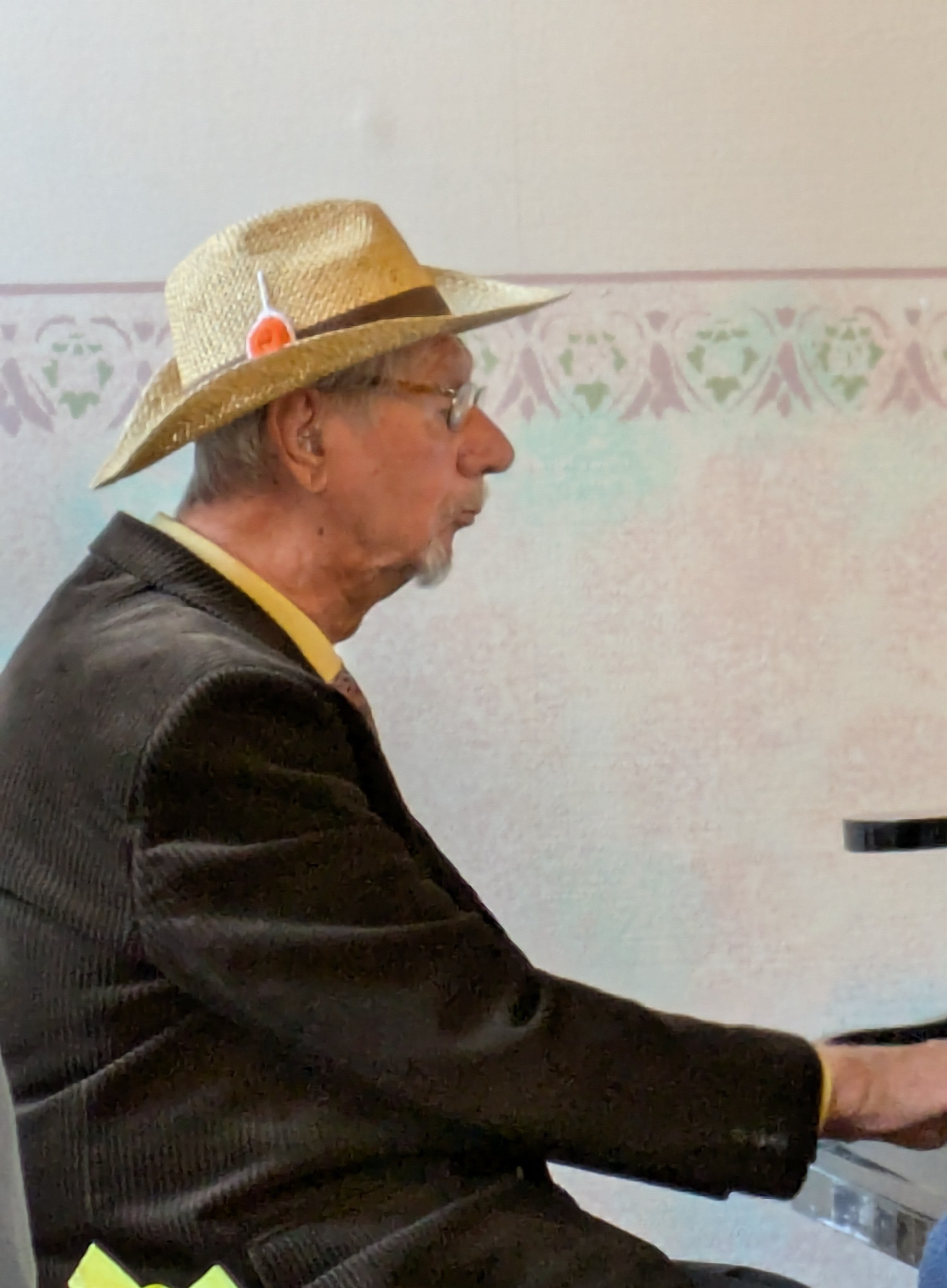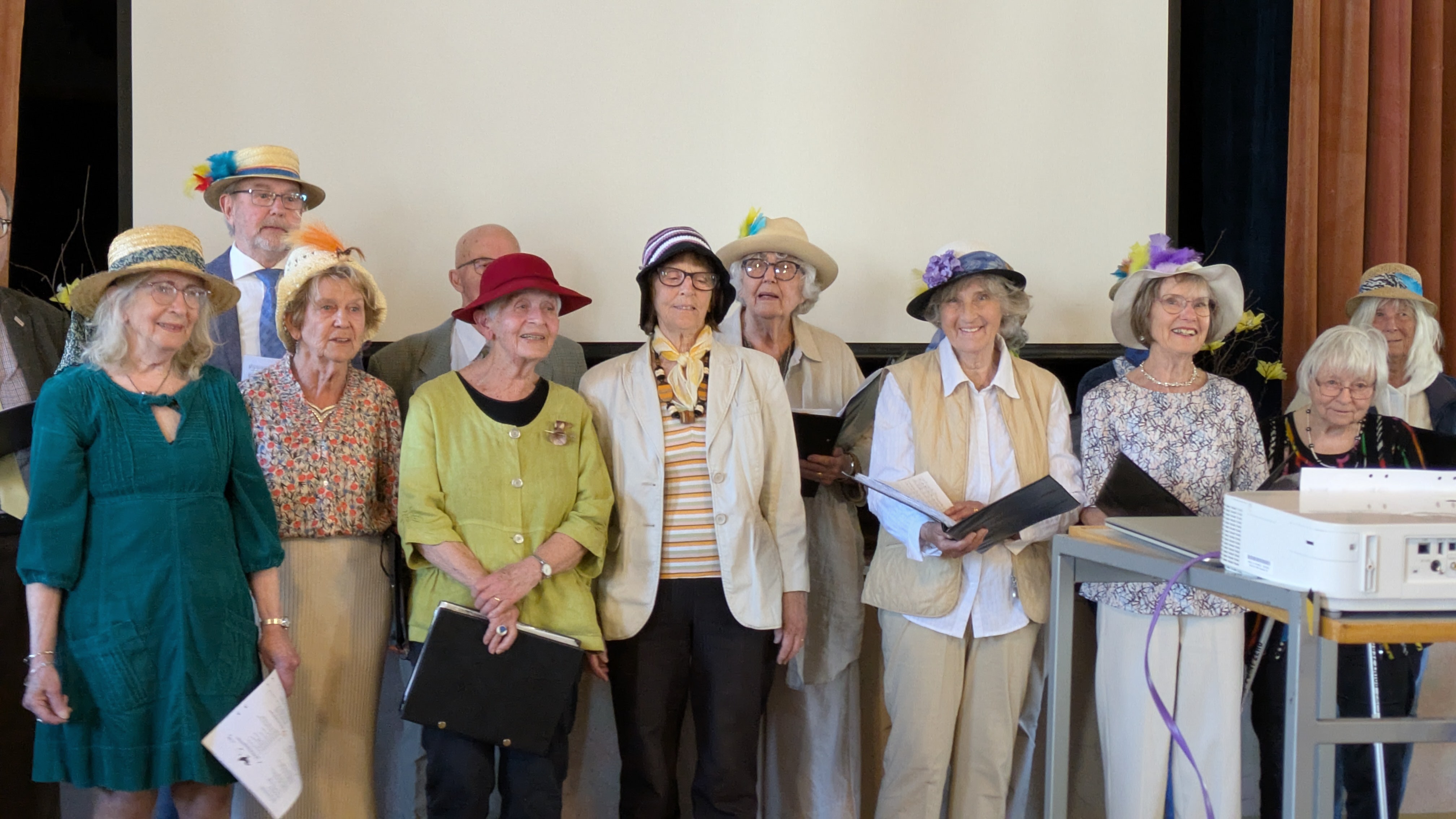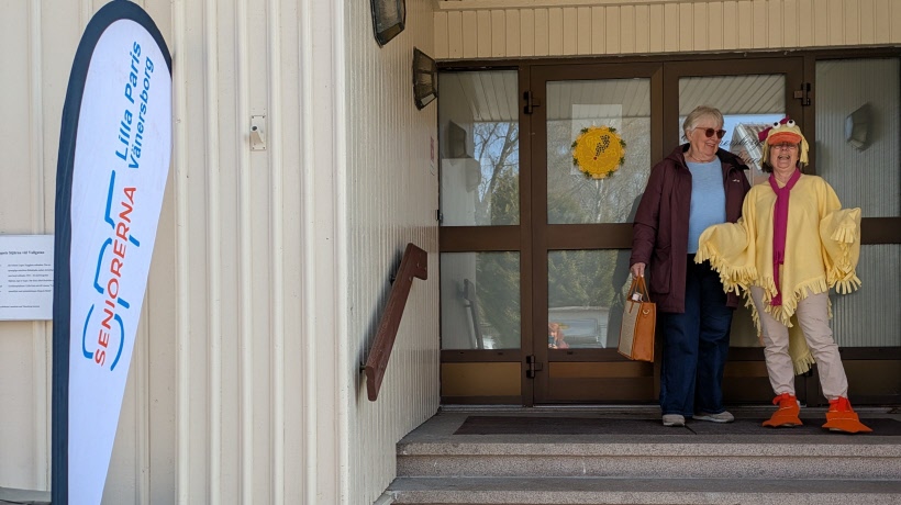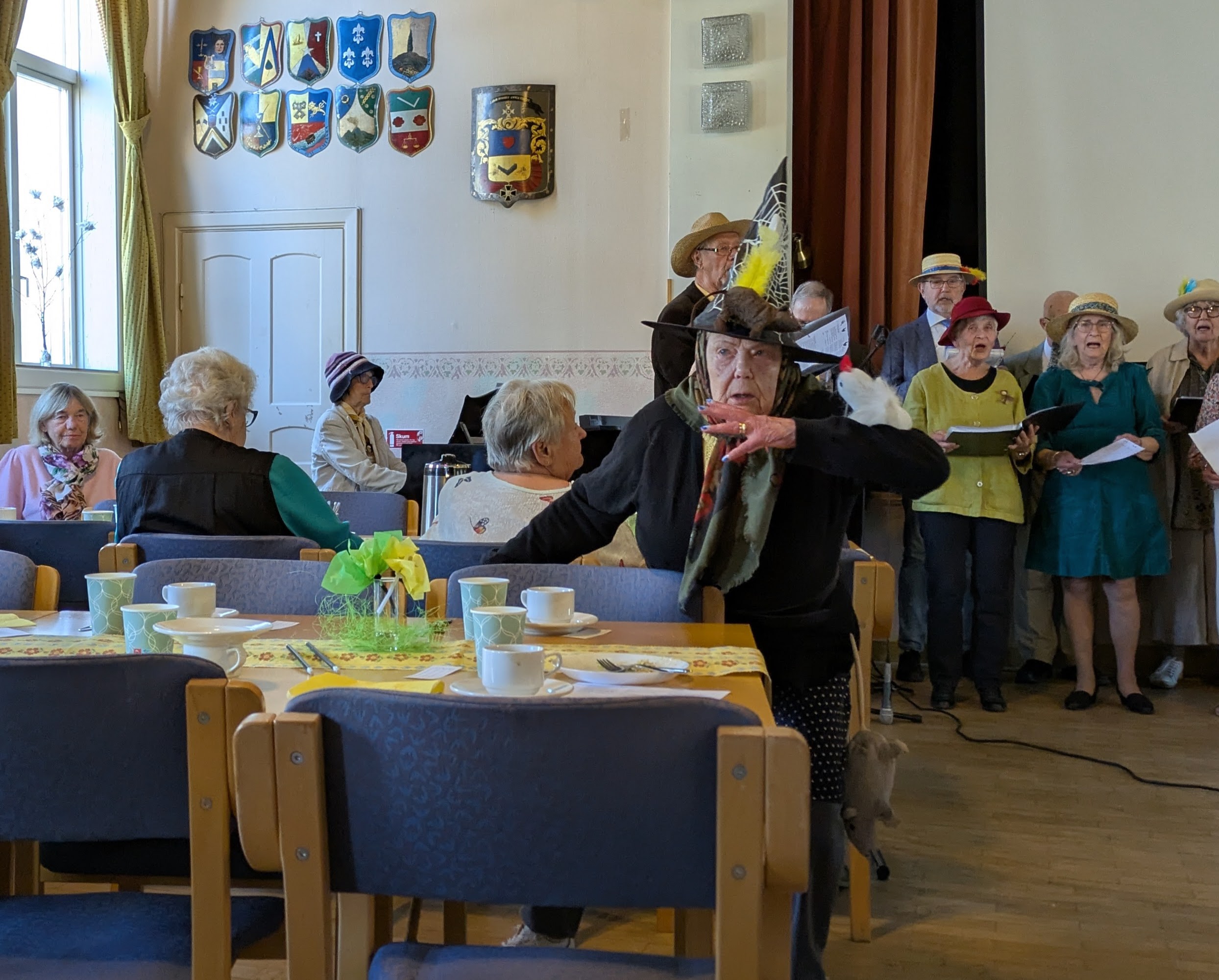Därefter kom kören i hattparad in i salen och sjöng vackert. Eftermiddagen blev en blandad mix av körsång, fika, allsång, Quiz och trevliga samtal med bordsgrannarna. Idag bjöds på macka samt godis till kaffet i ett gigantiskt påskägg med smaskiga chokladkarameller. Kören sjöng flera gånger, och allsången var skriven för påsken till kända andra melodier. På pianot kompade Ulla Björnheden till allsången. Quizen hade Dag Ekström med en mix av frågor både från växt och djurlivet samt Vänersborgs frågor. Hux flux fick vi även besök av en påskhäxa, som tog en sväng bland besökare innan fortsatt färd mot Blåkulla.