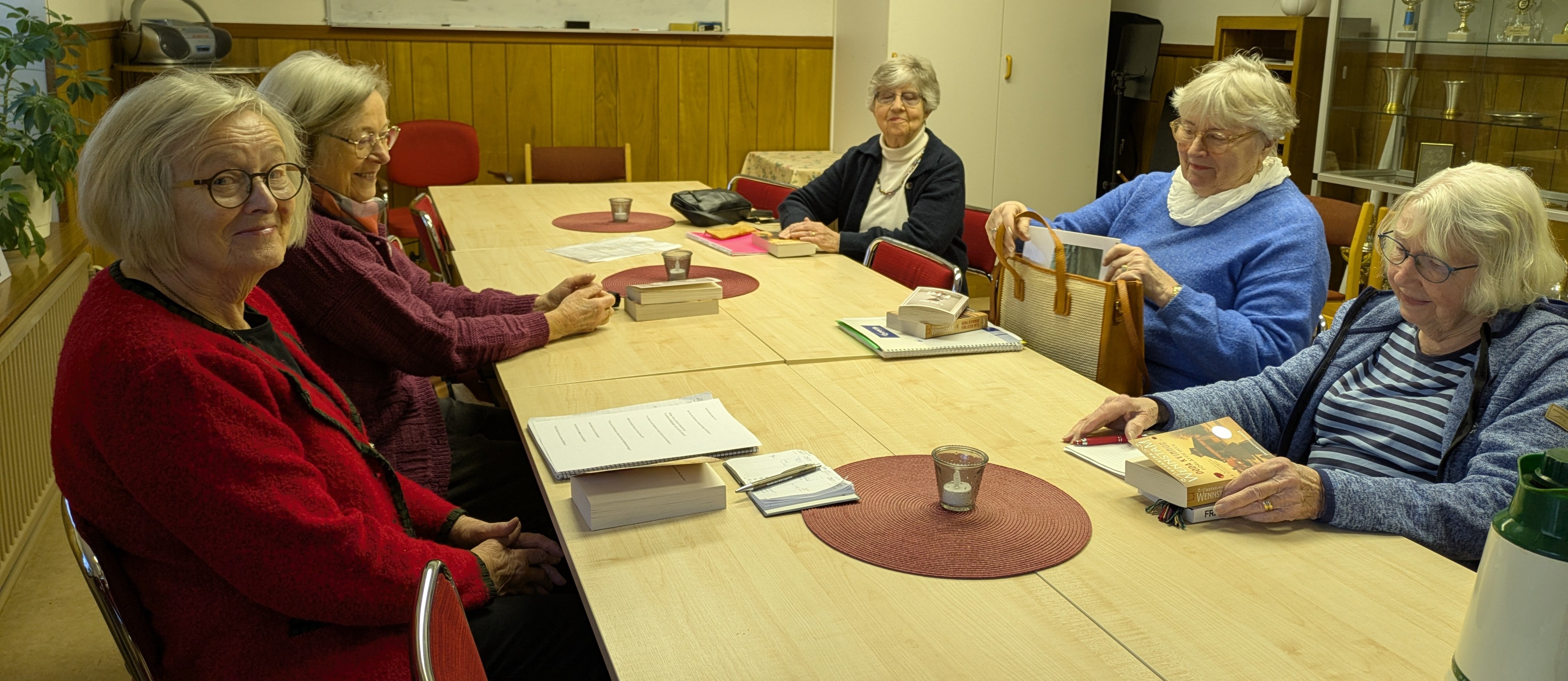 Gudrun Johansson leder bokcirkel nr 3 som har varit igång i tre terminer. Dagens bok att diskutera var Döda kvinnor förlåter inte av Katarina Wennstam. Här diskuteras både bokens innehåll och hur innehållet väcker funderingar, upplevelser ur var och ens egna minnen. Många intressanta händelser och diskussioner med kaffe med dopp på det.