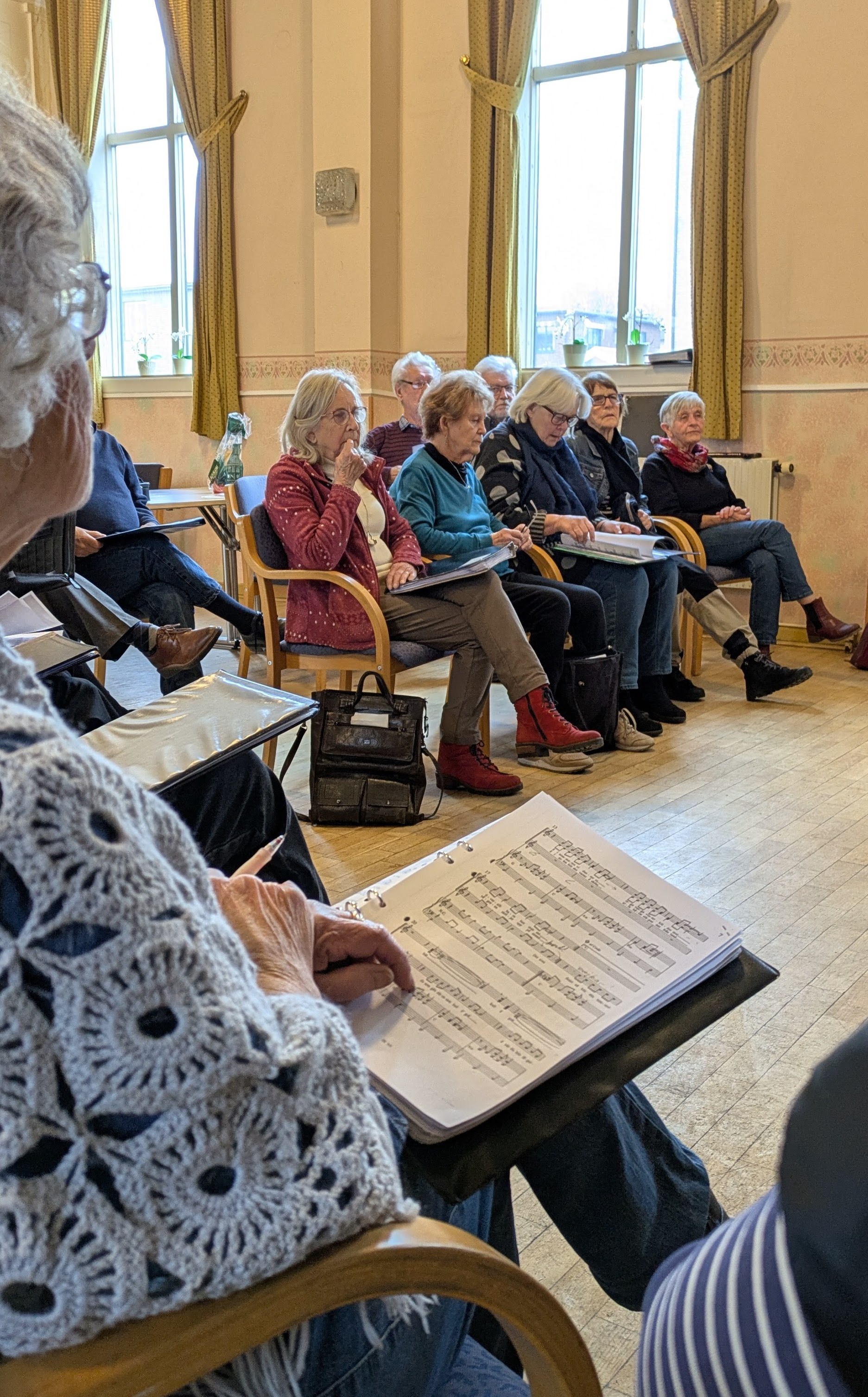 Sjungande och med vår i kroppen gick jag hemåt efter att ha tittat in hos SPF Kören som övnings sjöng i dag.Till och med solen tittade fram, säkert hit sjungen av kören. Ausma Pavulans leder kören som idag bestod av drygt 20 stycken sångare, med en blandad erfarenhet hos i SPF kören. Någon över 20 år till de som nyss börjat. Ulla Björnheden ledde uppsjungningen som innefattade uppvärming av både kropp och stämband. Redan här kunde man se och höra hur väl körsång gör både för de som sjunger och för de som lyssnar. Flera vårsånger hanns med innan det medhavda kaffet intogs. Bland annat sjöng man Här är Guda gott att vara, text och musik av Gunnar Wennerberg, Vår vid Vänern skriven av Gunnar Turesson samt flera sånger. I vår ska man göra ett flertal framträdande, passa på att lyssna på dessa duktiga sångare. Nästa tillfälle är den 10 april. I kören finns alltid plats för fler sångare. Ta kontakt med Ausma Pavulans auspa@me.com. Välkomna!