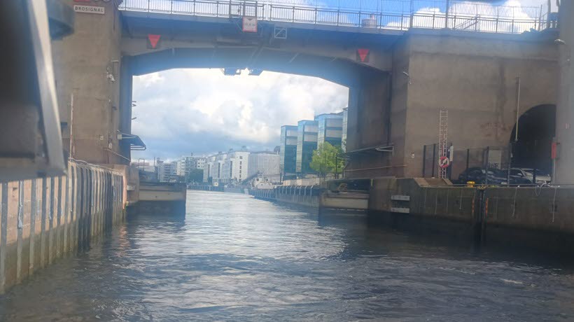 Med Sjöstaden i bakgrunden slussades vi genom Hammarbyslussen under Skanstullsbron ut i Årstaviken.