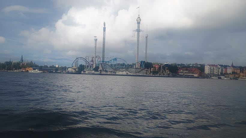 Mörka moln över Gröna Lund på väg in i Nybroviken.