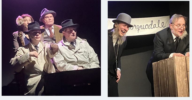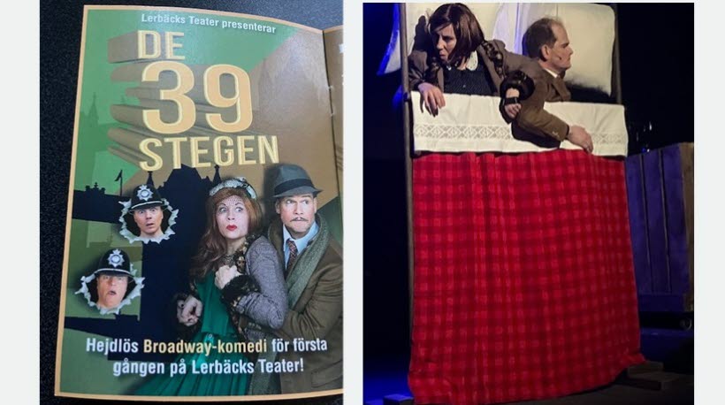 En hejdlös Brodway-komedi ”De 39 stegen” baserad på en film av Alfred Hitchcock efter en roman av John Buchan.
