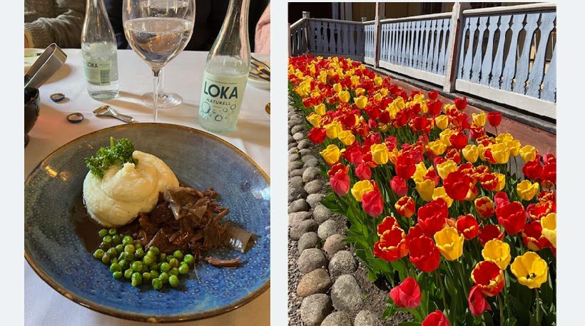 På Grythyttans Gästgiveri serverades en utsökt lunch i historiska välbevarade rum. I vårsolen utanför såg vi överdådigt praktfulla tulpaner.