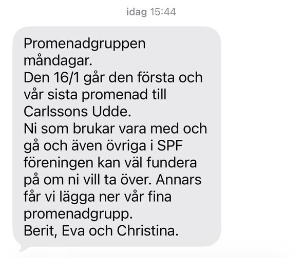 Jag hörde från Valberedarna att vi saknar en kantaktperson för promenadgruppen.