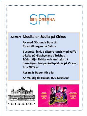 Största aktiviteten blir en musikal resa den 22 mars. En resa där vi hälsar alla, ung som gammal välkomna att följa med. Vi ser musikalen & Julia som kommer till Sverige och spelas på Cirkus i Stockholm. Det är en modern, humoristisk och färgsprakande komedi där Julia efter Romeos död väljer sitt eget lyckliga liv till slutet. Musik och sångtexter skrivna av Max Martin och vänner. I rollerna ser vi Joannè Nugas, Oscar Sia, Victor Norèn, Sussie Eriksson och Rennie Mirro med flera. Regi: Edward af Sillèn, som även regisserat Änglagård. Priset är 2055 kronor. I priset ingår resa med buss från Fellingsbro, middag på Glashyttan i Södertälje, föreställning och bussfika på vägen hem. Välkomna med anmälan snarast till Håkan Ahlgren 070-669 47 00.