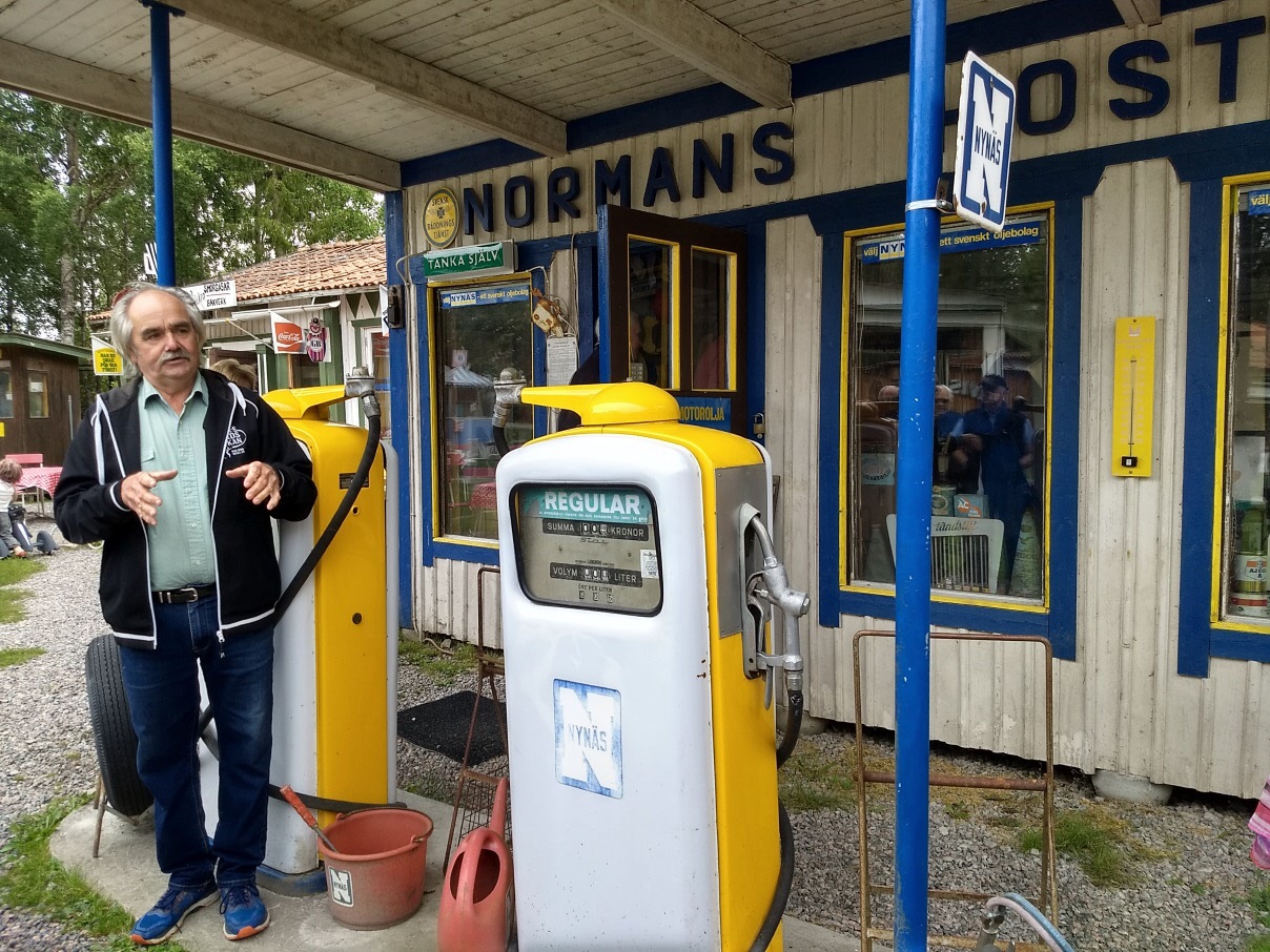 En fullt utrustad Nynäsmack. Bo blandar bensinpriser och anekdoter om hur det var på macken förr. Bl.a. när koncernchefen för Nynäs kom och hälsade på anonymt. -