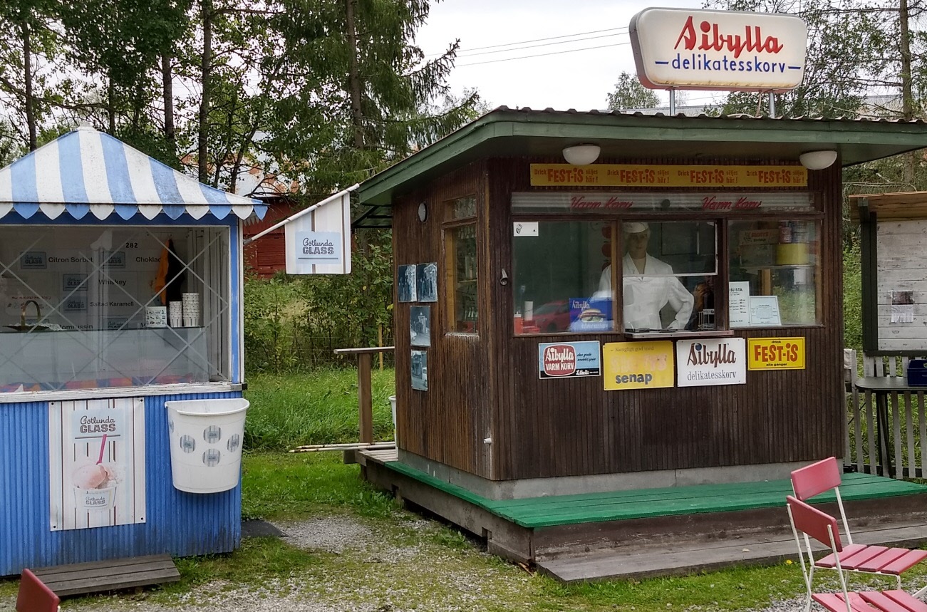 Korvkiosken kommer från Mora där den var en institution. Glasskiosken hade vunnits i en tävling men användes bara till privata tillställningar av ägaren. Samma ägare som till korvkiosken., -