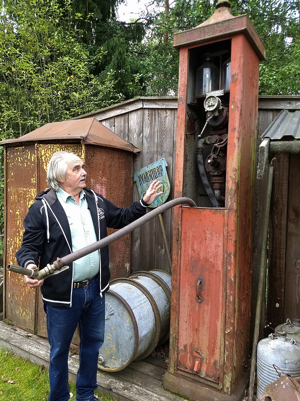 En av tre nu existerande bensinpumpar utan räkneverk. Man pumpade upp bensinen i glasbehållare av bestämd volym. -