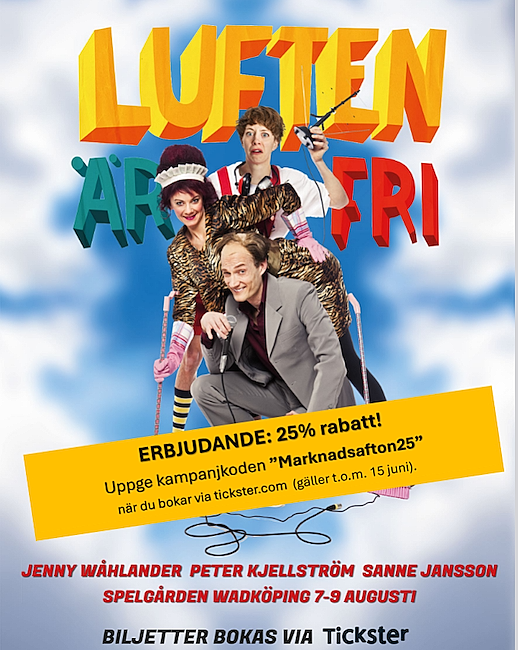 Peter Kjellström tillsammans med sina teaterkollegor Jenny Wåhlander, Sanne Jansson och Anton Kjellströmoch spelar i sommar en humorföreställning i Wadköping . Dom har även med sig ett fyrmanna liveband på scenen under ledning av Stefan Berglund.
