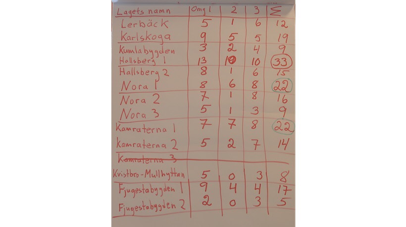 Utslagsfrågorna ledde till att Lag 1 från Nora blev tvåa och Kamraternas lag 1 blev trea.