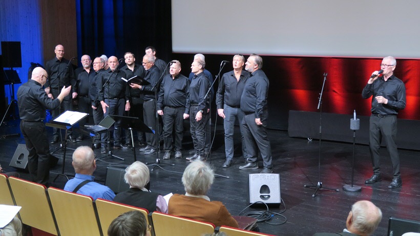 Efter lunch i Sjöängsskolans matsal fick vi lyssna till ett antal rock och popsånger med en del av Askersunds manskör. Kören har ca 40 medlemmar men eftersom många inte kan ta ledigt från sina jobb så fick vi nöja oss med 15 deltagare. De gjorde dock ett mycket bra framträdande med flera duktiga solosångare i gamla rocklåtar men också låtar som Honky Tonk Women av Rolling Stones och Cadillac av Hep Stars med flera.