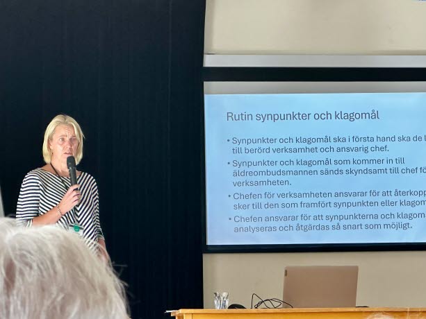 Vi hade också glädjen att hälsa vår Äldreombudsman Helena Engvall välkommen. Hon berättade om sitt arbete med insamling av inkomna klagomål från verksamheterna samt även positiva upplevelser. Hon sammanställer allt och skickar in rapporten till vård- och omsorgnämnden varje år. Detta utgör en viktig information hur de olika vårdföretagen verkställer sitt arbete och ger en bra grund för vidare upphandlingar.