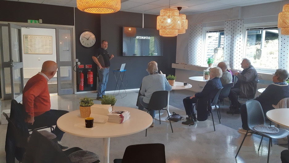 Johan Jern, tryckerichef i Åtvidaberg tog emot oss, hälsade oss välkomna och bjöd på kaffe. Johan visade ett bildspel om företag och produktsortiment.